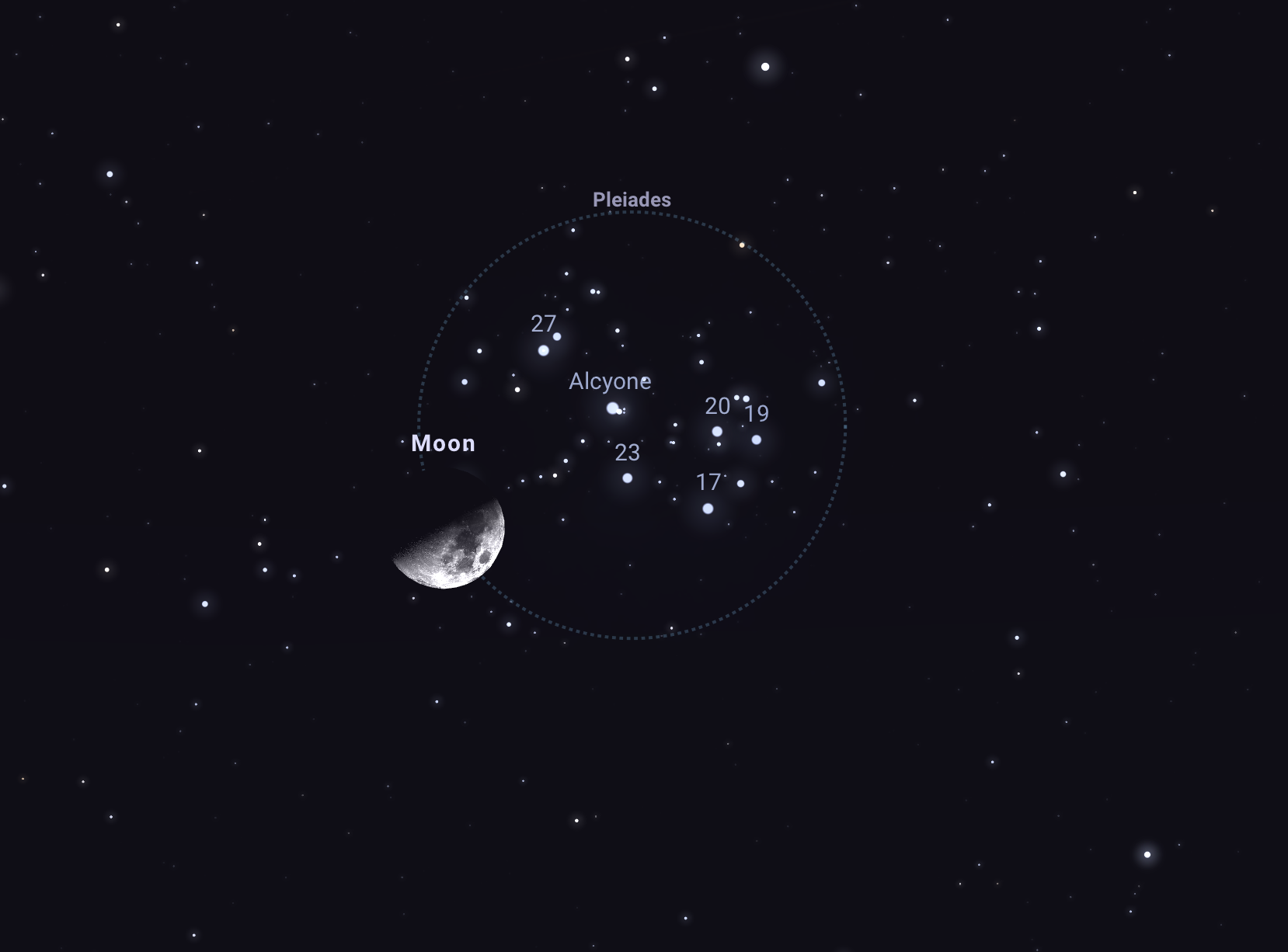 Az együttállás során kísérőnk mindössze bő fél fokra lesz a Fiastyúk legfényesebb csillagától, az Alcyonétól, úgy, hogy a látszólag onnan kiinduló hatos csillaglánc egyenes folytatása lesz a Hold terminátorának – fantasztikus látványnak ígérkezik!