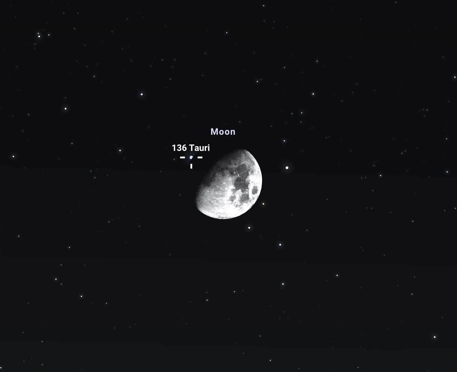 Folytatja nagy menetelését a Hold, hajnali 02:54-kor elfedi a 4,6 magnitúdós 136 Tau csillagot, amely 03:46-kor lép ki 74%-os megvilágítottságú kísérőnk fényes pereménél.