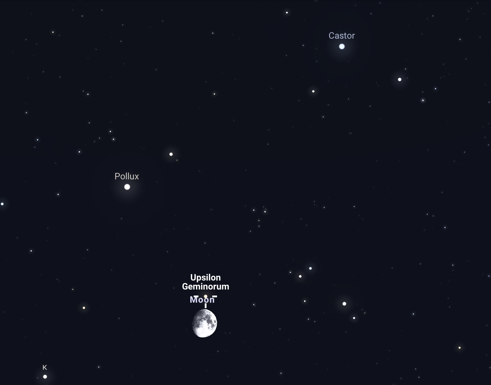 Nincs pihenő, Holdunk a következő éjszakákon újabb látványos jelenségekkel jelentkezik. Miközben megvilágítottsága 88%-ra növekszik, 22:24-kor kevesebb mint fél holdkorongnyira közelíti a 4,1 magnitúdós Üpszilon Gem-et. Az Ikrek bétája, az 1,3 magnitúdós Pollux mindeközben 3 fokra lesz kísérőnktől. Szabad szemmel, de főként binokulárral pazarnak ígérkezik a látvány, és persze készüljünk fényképezőgéppel is.