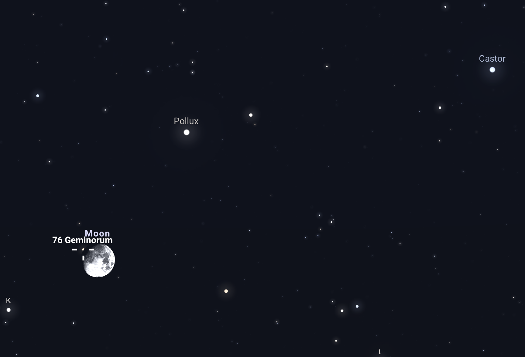 Ugyanezen éjszaka hajnalán, már 21-én 02:44-kor a Hold elfedi az 5,4 magnitúdós 76 Gem csillagot, amelynek kilépésre 03:42-kor kerül majd sor.
