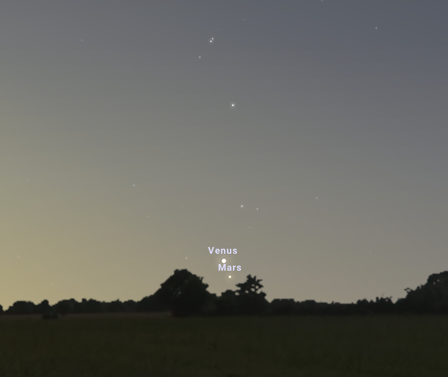 Ezen a hajnalon, a polgári szürkület kezdetén a Vénusz és a Mars újra összeáll egy párosra, a keleti horizont felett, egymástól mindössze 36 ívmásodpercre lesznek megfigyelhetőek.