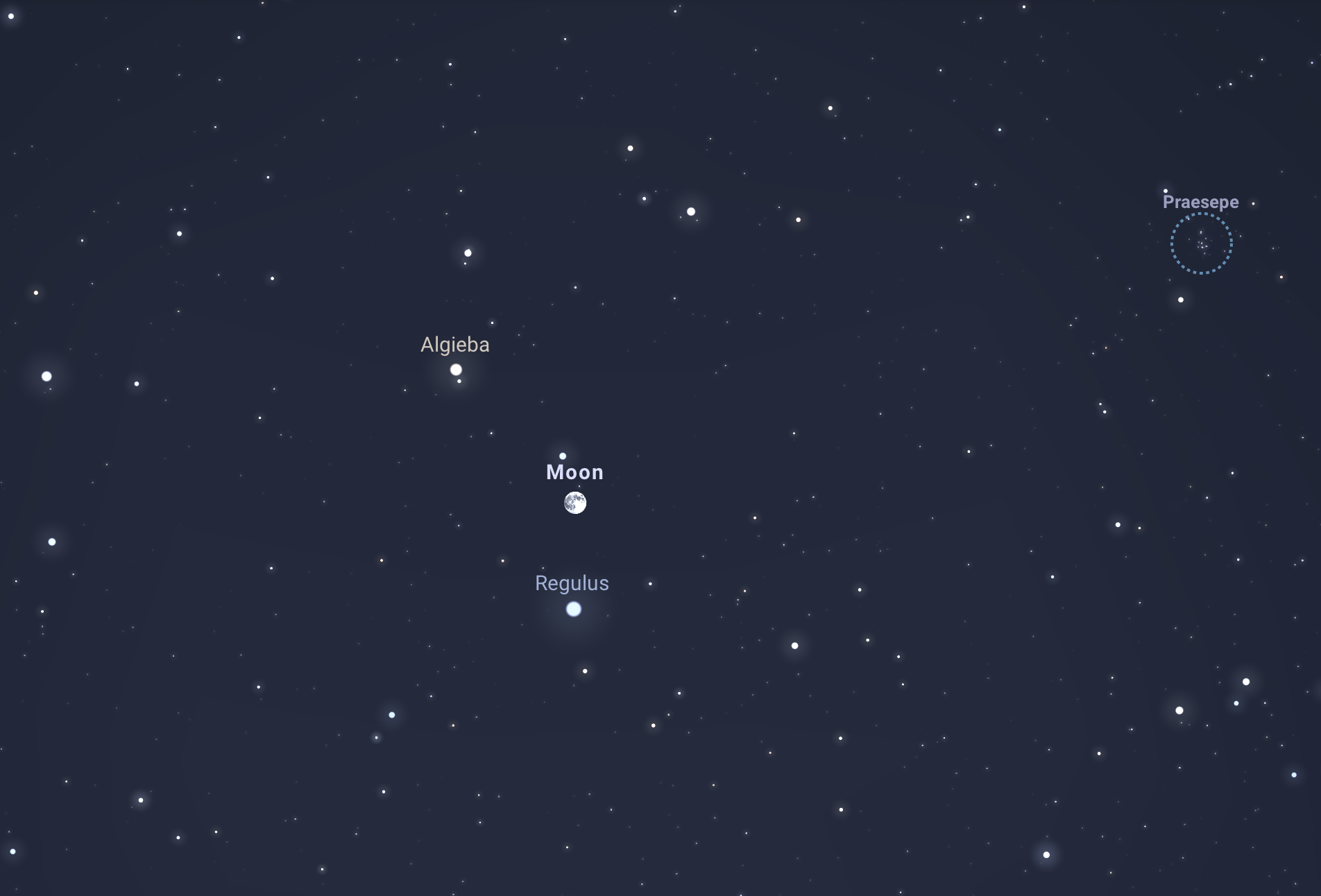 Újra a Hold és újra együttállás, ezen az éjszakán 23:20-kor kísérőnk 3,5 fokra közelíti majd az 1,4 magnitúdós fényességű Alfa Leo-t, azaz a Regulust, az égbolt 22. legfényesebb csillagát.