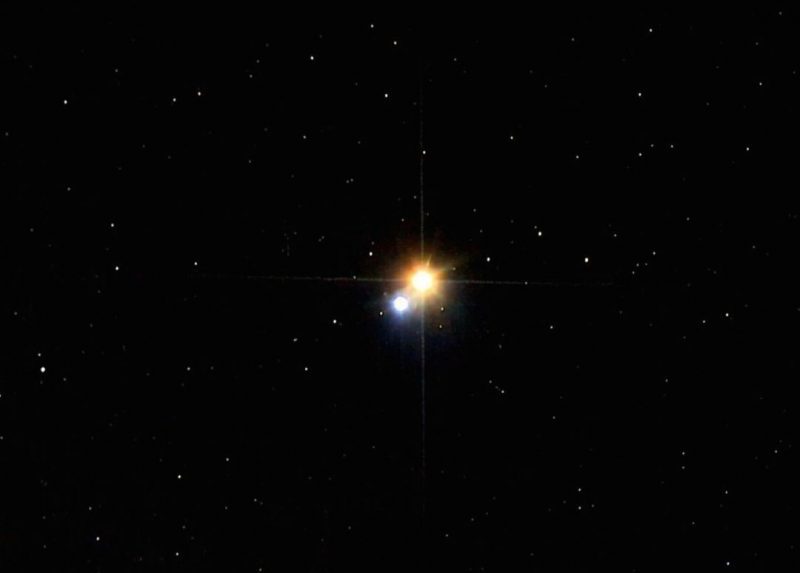 A fényesebb, 3,1 magnitúdós narancssárga főkomponens mellett kellemes távolságra, 34 ívmásodpercre fekszik az 5,1 magnitúdós kékesfehér kísérője.