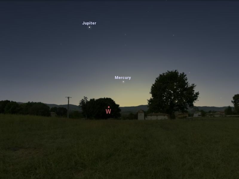 A legjobb lehetőségünk, hogy az idei évben naplemente után észleljük a Merkúrt, vasárnap este lesz. Miután 18:00-kor a horizont alá bukik a Nap, egyre jobban látható lesz a bolygó a nyugati égbolton. Ekkor 16 fokos magasságban fog elhelyezkedni, és 44%-os fázisa lesz. A fényessége 0,08 magnitúdó, ami igencsak szembetűnő a keresőtávcsövekben. Fél órával később már szabad szemmel is látható lesz, kicsivel több mint 11 fok fölött. Végül 19:43-kor a horizont alá bukik, azonban így is egy óránál tovább is észlelhetjük szerencsés esetben.