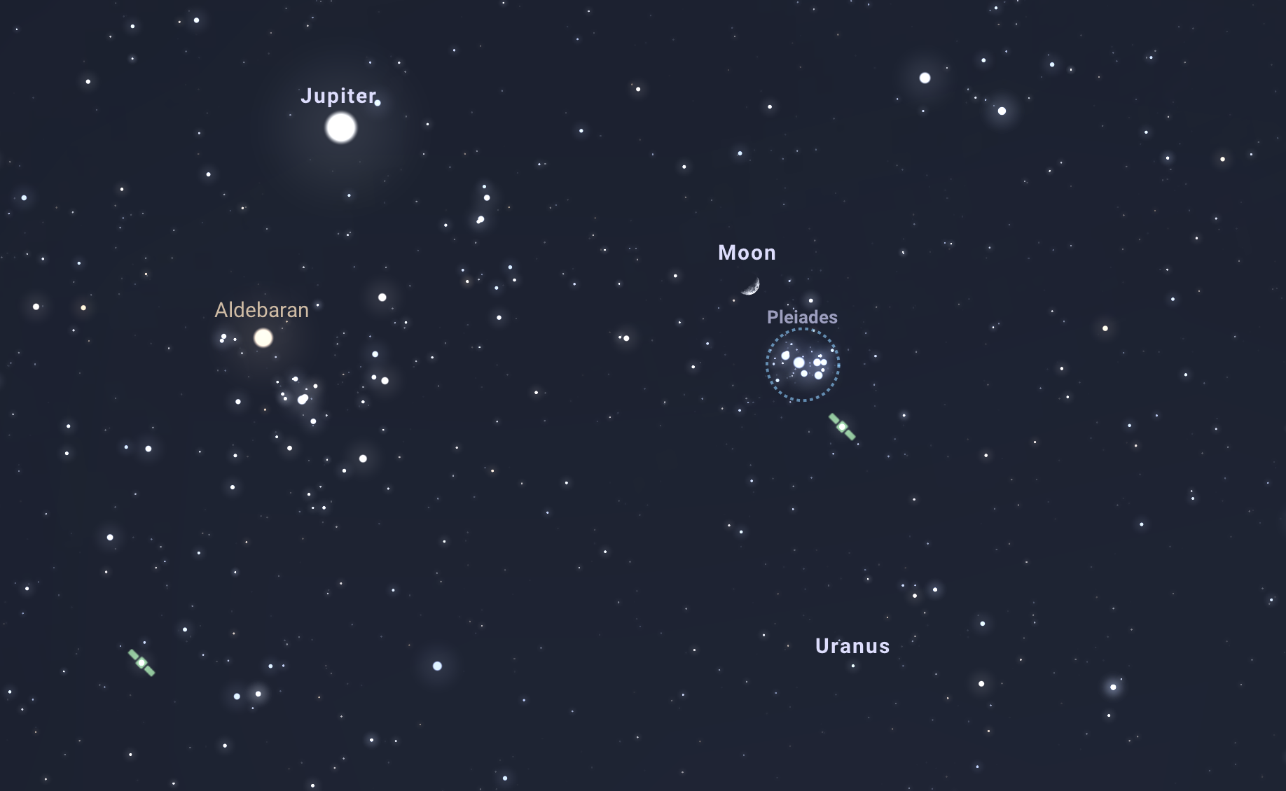 Március 5-én 18:45-től a 13 fokos magasságban ragyogó Vénusztól vigyük feljebb a tekintetünket, 58 fokra a horizonttól találjuk majd a 39%-os fázisban levő holdsarlót, amint bő két fokra közelíti meg az M45 nyílthalmazt, azaz a Fiastyúkot. Pazar látványnak ígérkezik, de az erős holdfény miatt egy kézi látcsővel is készüljünk megfigyelni az együttállást, hogy biztosan ne maradjunk le róla. Különösen hogy a Jupiter és a Bika alfája, az Aldebaran is asszisztál majd a jelenséghez, kiváló asztrofotótémát szolgáltatva. Miután kigyönyörködtük magunkat az égi jelenségben, folytathatjuk is a Vénusz hamuszürke fényének vadászatát.