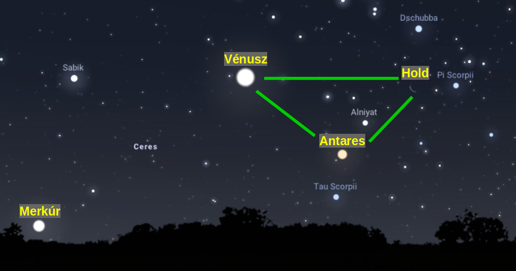 Ekkor ha sikerül megtalálnunk a Holdat, a háromszög alakja is könnyen felbukkan majd: Esthajnalcsillagunk, a rikító fényességű Vénusz ekkor ugyanis 8 fok távolságra lesz tőle. A Vénusz alakja is sokszor látszik hazánkból, és sokan - tévesen - csillagnak hiszik. Úgy könnyű megkülönböztetni egy bolygót egy csillagtól az éjszakai égbolton, hogy a csillagok előtt a levegő vibrálni látszik, míg a bolygók előtt ez a jelenség nem figyelhető meg.