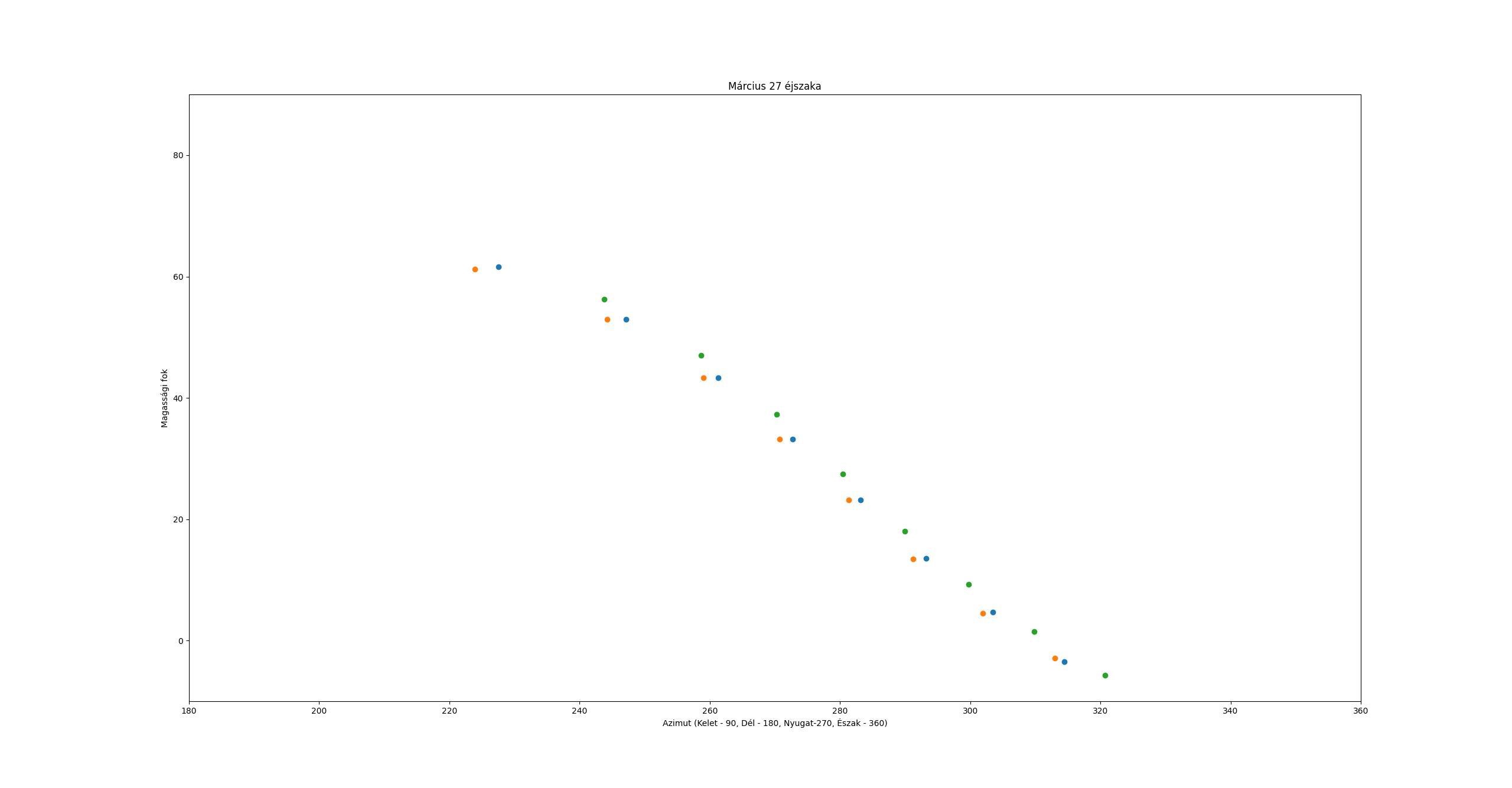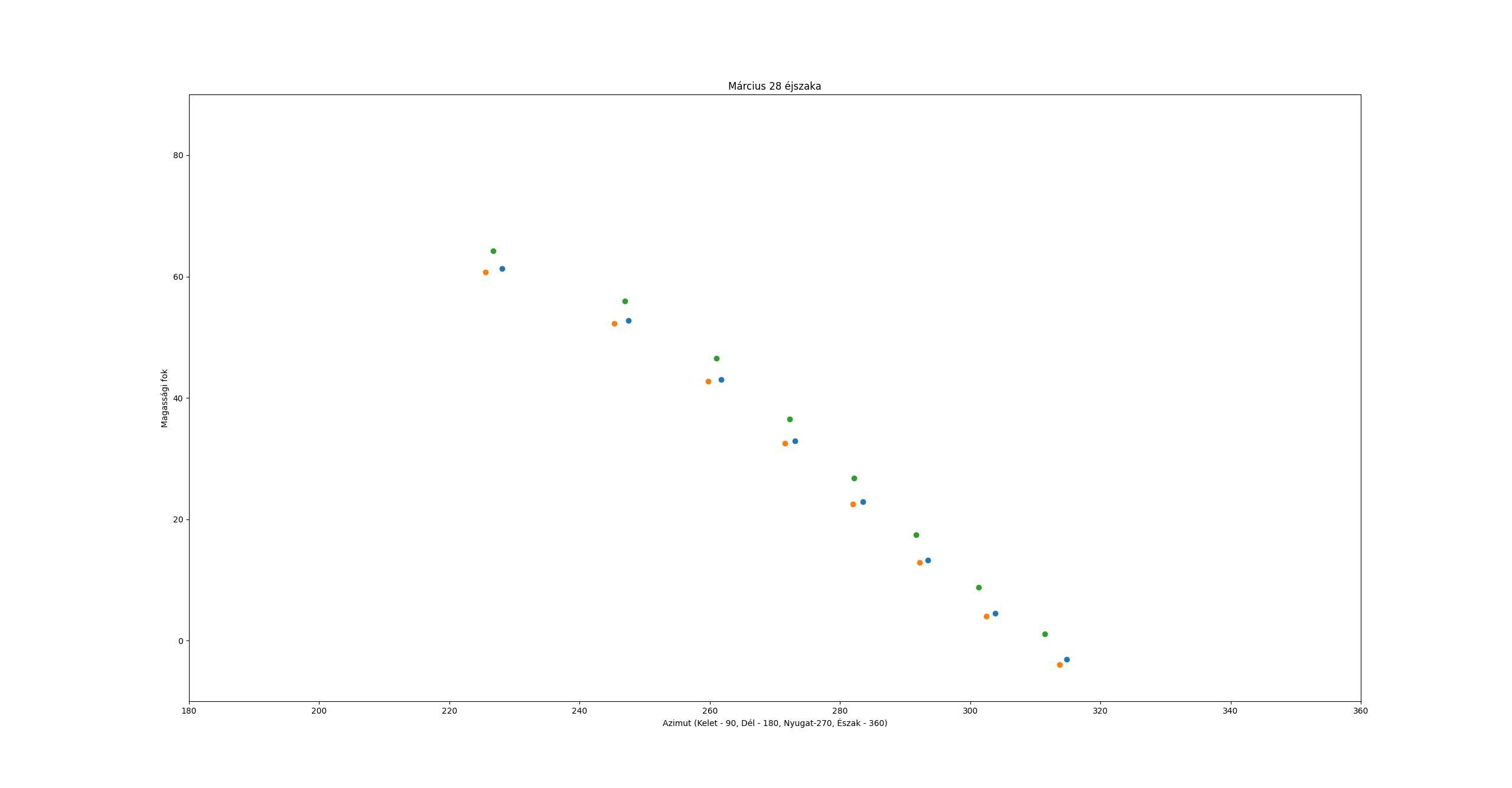 Ahogy a fenti képen láthatjuk, bár még nem csatlakozik a duóhoz, a Holdat is meg tudjuk figyelni, mert már viszonylag közel fog elhaladni mellettük. Nagyjából 6 fokkal lesz a horizonthoz közelebb, míg az azimutja nagyjából 14 fokkal lesz több, tehát egy picit nyugatabbra lesz először, majd később északabbra. Az ábrán jól látszik, hogy a Hold nagyjából ugyanazokon a pontokon jelenik meg, mint a Mars–M35 duó, azonban egy órával korábban érkezik meg mindenhova. Másnapra azonban összhangba kerül ez a mozgás.