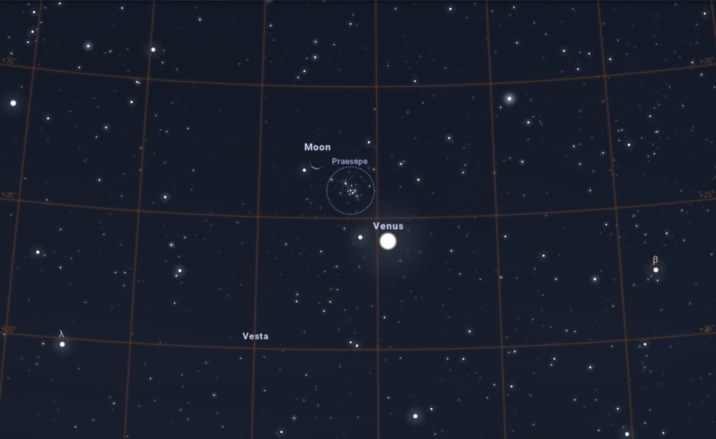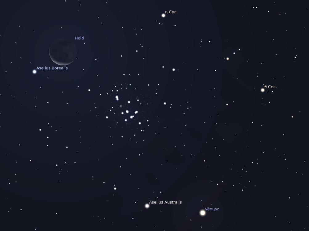 A közrefogott Méhkas halmaz sziporkázó csillagaitól jobbra lefelé a Vénusz bolygó pontszerű, de félelmetesen fényes bolygótükre tündököl, míg a csillaghalmaz bal felső oldalán a nagyméretű vékony holdsarló halványabb, de monumentális urasága trónol.