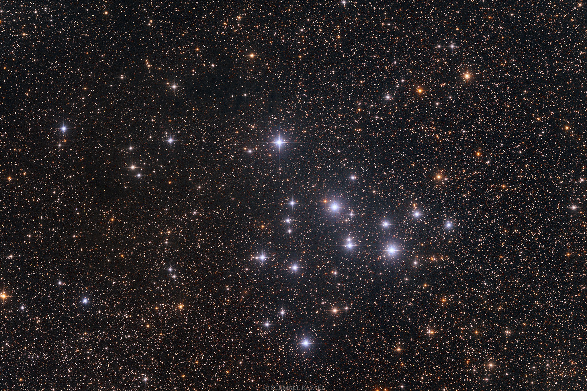 Az égbolton akkora területet foglal el, mint a telihold, és szabad szemmel ideális körülmények között éppen látható. A halmazt Guillaume Le Gentil fedezte fel 1750-ben szabad szemmel, majd Charles Messier 1764. október 24-én vette fel híres katalógusába, de van nyoma annak, hogy Arisztotelész is leirt „valami ködösséget” az égbolt azon részén Kr. e. 325.ben, de pontosabb helymeghatározás nélkül.