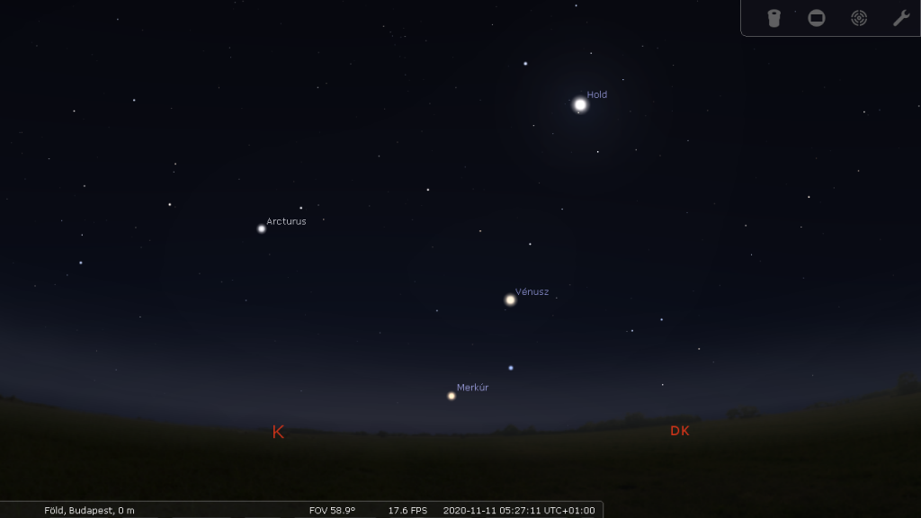 A 19 fokos elogációban járó 57%-os fázisú félmerkúr most kiválóan megfigyelhető. November 10-én napkelte előtt mindhárom égitest fényesen emelkedik a horizont fölé.