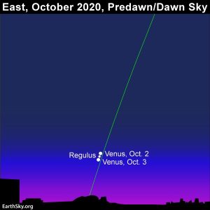 A Hold és a Mars után térjünk vissza az Oroszlánhoz az éjszaka legvégén, hisz az október harmadikai hajnal tartogat még szépségeket. A Vénusz és a Regulus együttállásának megfigyeléséhez nem kell távcső, de még szemüveg sem, hisz az Esthajnalcsillag az Oroszlán legfényesebb csillagát látogatja meg. Az egymástól alig 10,5 szögpercre lévő páros szabad szemmel is szép kettősnek látszik, kistávcsővel pedig a dagadó Vénusz felhősávjait csodálhatjuk majd meg.