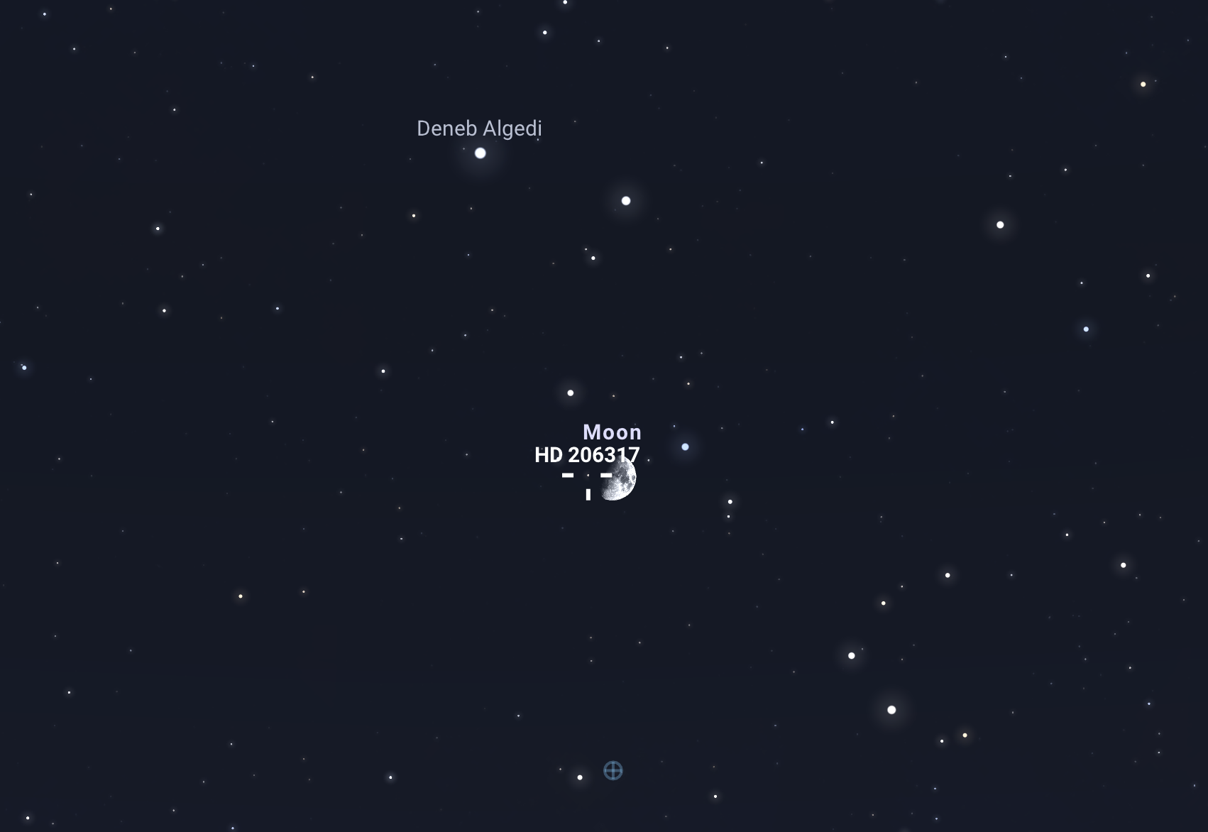 Holdunk októberben nem tud leállni, sorra produkálja a fedéseket. Ezen az éjszakán két áldozatot szed: 20:26-kor a 7 magnitúdós HD 206317 tűnik el kísérőnk sötét oldalán 23 fokos horizont feletti magasságban, 21:20-kor pedig a HD 206546 spektroszkópiai kettős következik 22 fokon.