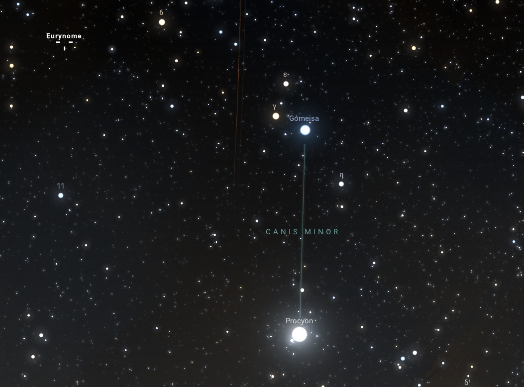 A harmadik és egyben utolsó januári oppozíció az ötvenegyedikként felfedezett Nemausa kisbolygóé. Az előző kis égitesttel szomszédos csillagképben, a Canis Minorban, azaz a Kis Kutyában látszik majd a szembenállása idején, tehát január 15-én 00:12-kor, ezt azonban kicsit könnyebben megtalálhatjuk, mint a rejtőzködő Eurynomét. A halvány, 10,7 magnitúdós látszó fényességű, 150 km-es átlagos átmérőjű Nemausa ugyanis a Kis Kutya csillagkép két jellegzetes, fényes csillaga, a Procyon és a Gomeisa között helyezkedik majd el. Az egész éjjel látszó kisbolygó felkeresését már a kora esti órákban is ajánljuk, de mivel a Mars bolygó hajnalban fényesen ragyog az égen, emiatt érdemes éjszakázni!