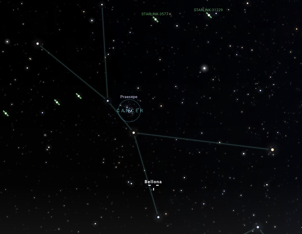 Végül, de nem utolsósorban megemlítjük a bónusz-oppozíciót is, amely február elsején, vasárnap hajnalban, 03:06-kor történik majd meg. Ekkor a huszonnyolcadikként felfedezett, 10 magnitúdós látszó fényességű, 120 km-es átlagos átmérőjű Bellona kisbolygó ér e nevezetes égi pozícióba. Az égitest a Rák csillagképben látszik majd, nem messze a Messier 67 jelű fényes csillaghalmaztól. Mint hogy a Rák a téli égbolt nevezetes csillagképe, markáns alakzata miatt viszonylag egyszerűen észrevehető az égbolton. Itt is az egész éjszaka kedvezően látható kisbolygót már előző este is célba vehetjük távcsövünkkel egy szép holdsarló megtekintése után mondjuk egy-két órával.
