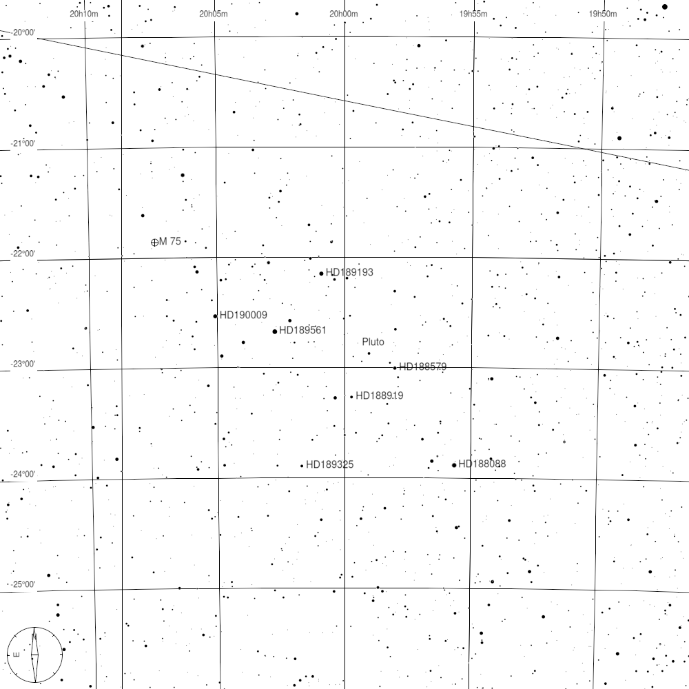 A törpebolygó oppozíciója július 20-án éjszaka figyelhető meg. Időpontja helyi idő szerint hajnali 3:33 óra. Ekkor 11° 31' magasan látható az égen a Sagittarius (Nyilas) csillagképben, nagyjából öklömnyire a horizont felett délnyugati irányban. Detektálására a legjobb időpont az éjszaka folyamán 0:51-kor adódik, ekkor tartózkodik legmagasabban, 20° 1'-cel, vagyis arasznyira a horizont felett pontosan déli irányban. A törpebolygó megtalálását néhány fényesebb égi objektum segíti, amelyek közül az egyik a szabad szemmel is látható csillag, az omega Sgr (4,7 magnitúdó), amelytől a Pluto 3° 30' távolságra található 8° irányban (észak). Az égboltot jól ismerők számára támpontot jelenthet a Messier 75 gömbhalmaz, tőle 2° 3'-re találjuk a Plutót 243° irányban (nyugat-délnyugat). A HD 189561 jelű csillag keresőtávcsövekben is jól látható (6 magnitúdó), a Pluto hozzá egész közel, mindössze 46' távolságra található 262° irányban (nyugat). A keresésben ugyancsak segítségünkre lehet a HD 188919. Jól látható keresőtávcsővel és binokulárral egyaránt (8 magnitúdó), a Pluto tőle alig fél fokra lesz (29') 353° (észak) irányban. Mindenképp érdemes sötét vidéki ég alatt észlelni a rendkívül halvány objektumot.