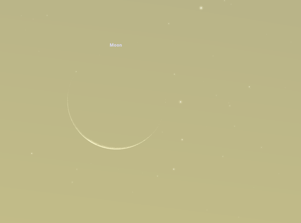 Vasárnap már nagyobb szerencsére és észlelési tapasztalatra lesz szükség ahhoz, hogy észrevehessük a Hold sarlóját. Ezen a napon mindössze 15 óra 55 perccel újhold előtt lesz kísérő égitestünk sarlóalakzata, így még a szombatinál is jócskán vékonyabbnak látszik majd. Az is megnehezíti az észlelést, hogy szinte pontosan a keleti horizonton látszik majd, afelett mindössze 0,4 fokkal. A polgári szürkület kezdetén, 5:59-kor kel az égitest, így ekkor van a legnagyobb esélyünk arra, hogy megtaláljuk a már erősen világosodó égbolton. Egy ilyen keskeny holdsarló megfigyelése a hazai rekordok közé is bekerülne!
