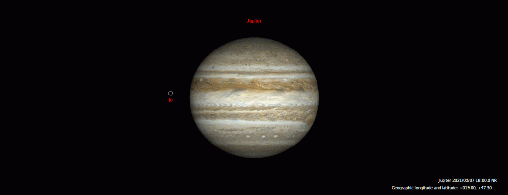 - A kilépés helye: Mivel a Jupiter árnyéka most ferdén nyúlik el a korong mellett, amelyik hold közelebb kering hozzá, az koronghoz közelebb látszik kilépni. Éppen ezért az Io a felhősávok szélétől 9 ívmásodpercre, az Europa 15”-re, a Ganymedes 27”-re, a Callisto merő 48”-re lép ki az árnyékból.