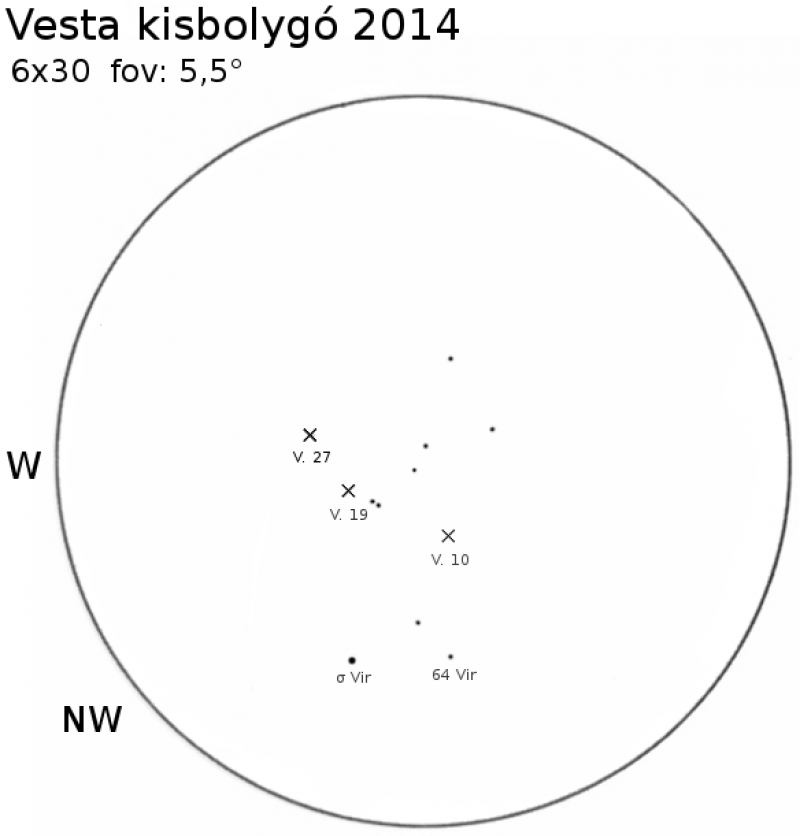 Ráadásul az, hogy a Nappal ellentétes oldalon helyezkedik el az égen, azt jelenti, hogy amikor a legsötétebb az égbolt, éppen akkor jár a horizonttól legtávolabb, körülbelül 22 fok magasságban , így megfigyelésére nagyon jó lehetőség kínálkozik. Fényessége az oppozíció idején 5,9 magnitúdó lesz, ami már egy nem tökéletes egű helyről is szabadszemes objektummá teszi a Vestát.
