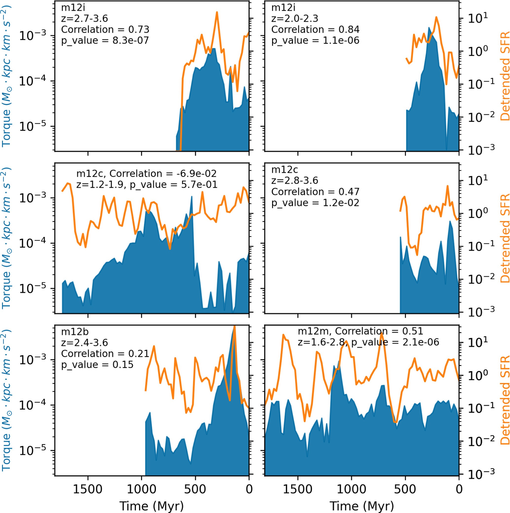 A szimulációk kimutatták, hogy a nagyobb kölcsönhatások során, ahol a két galaxis tömege közelebb áll egymáshoz, nagyobb korreláció áll fenn a társgalaxis forgatónyomatéka és a csillagkeletkezés sebessége között: a nagyobb forgatónyomaték gyakran berobbantja a csillagkeletkezést. A galaxis csillagkeletkezési története azonban több ilyen fellángolást mutat, és ezek többnyire nem kapcsolódnak más galaxissal történt kölcsönhatáshoz.