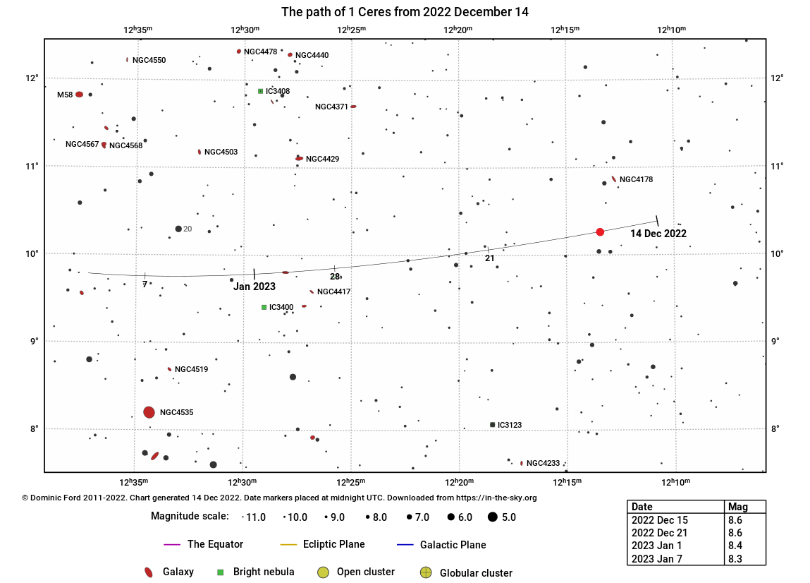 A kis Ceres igen halvány, mindössze 8,6 magnitúdós, vagyis kistávcsővel, közepesen fényszennyezett vidéki égen nézve még látható. Az együttállás apropóját az adja, hogy az 5,9 magnitúdós 12 Vir csillagtól mindössze 2 ívperccel halad majd el nyugatra.