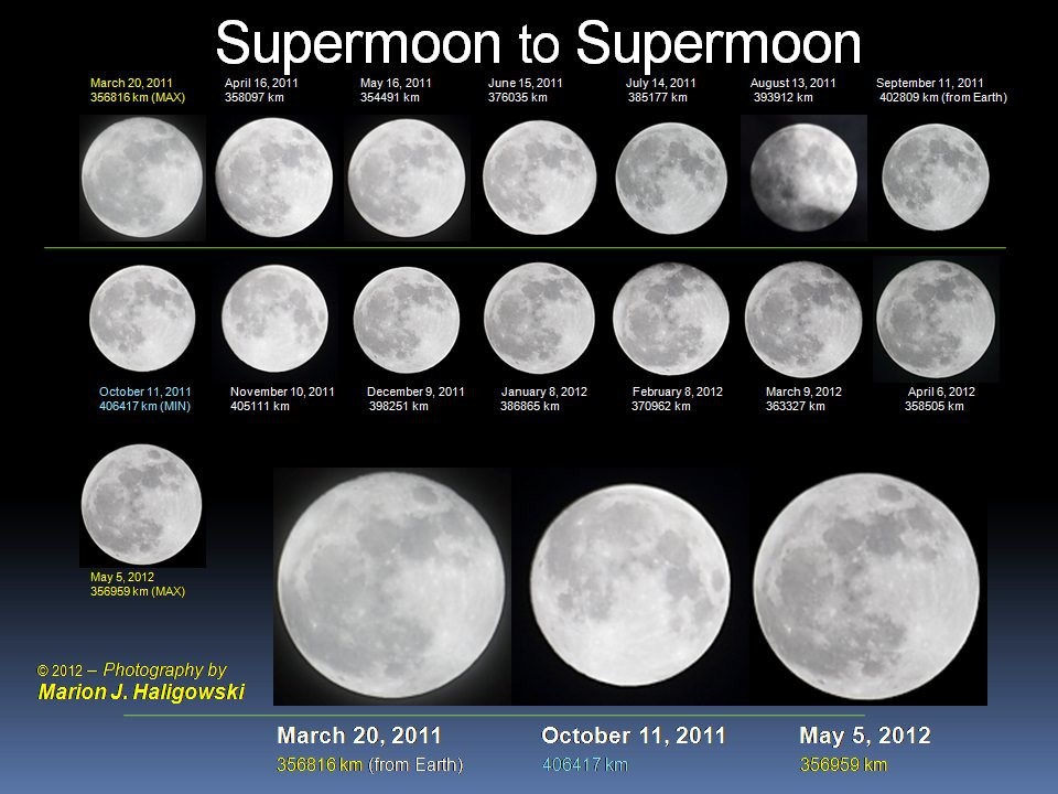 A képsorozat a Hold egyéves változásait mutatja 2011 és 2012 között. Koncentráljunk a földközelben lévő Holdakra: nincs nagy, látványos különbség. A sajtó nívótlanabbik fele elterjesztette, hogy ha a Hold 360 000 km-nél közelebb van a Földhöz, azt szuperholdnak hívják – a hiba ott van az egyenletben, hogy erről egyetlen csillagászt sem kérdeztek meg, amennyiben ugyanis hozzáértők véleményét kérték volna, úgy tudnák, hogy soha, senki a hivatásos vagy amatőrcsillagász berkekben nem tartotta érdekesnek a 360 000 km-es mesterséges határt. Van, amikor a Hold ennél közelebb van hozzák a perigeumban (földközelben), és van, amikor távolabb.