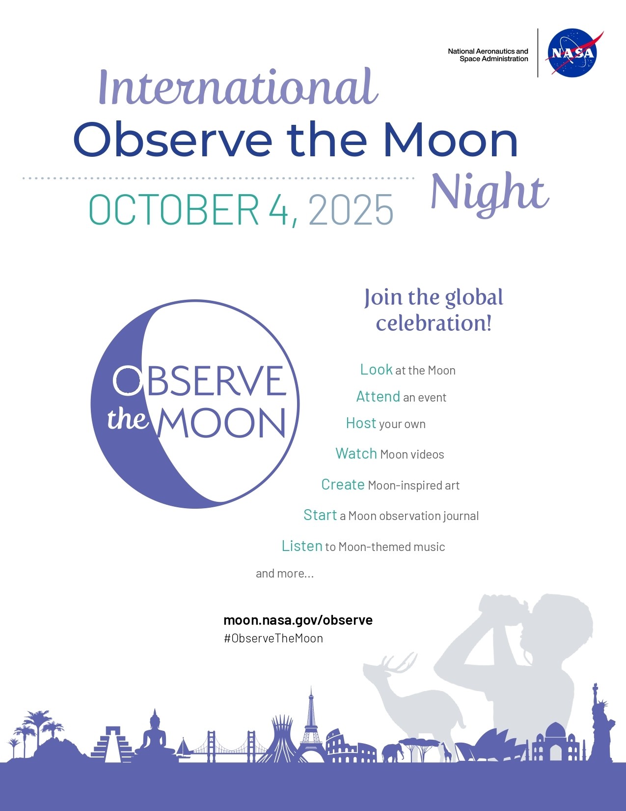 A NASA arra biztat mindenkit, hogy együtt nézzük és ismerjük meg bolygónk társát, a Holdat. Bátran lehet csatlakozni a Svábhegyi Csillagvizsgáló eseményéhez vagy pedig környezetünk szervezetei, intézményei által rendezett programokhoz, de akár egyénileg is megfigyelhetjük ezen vagy bármely estén szabad szemmel, binokulárral vagy távcsővel a Földet kísérő égitestet.