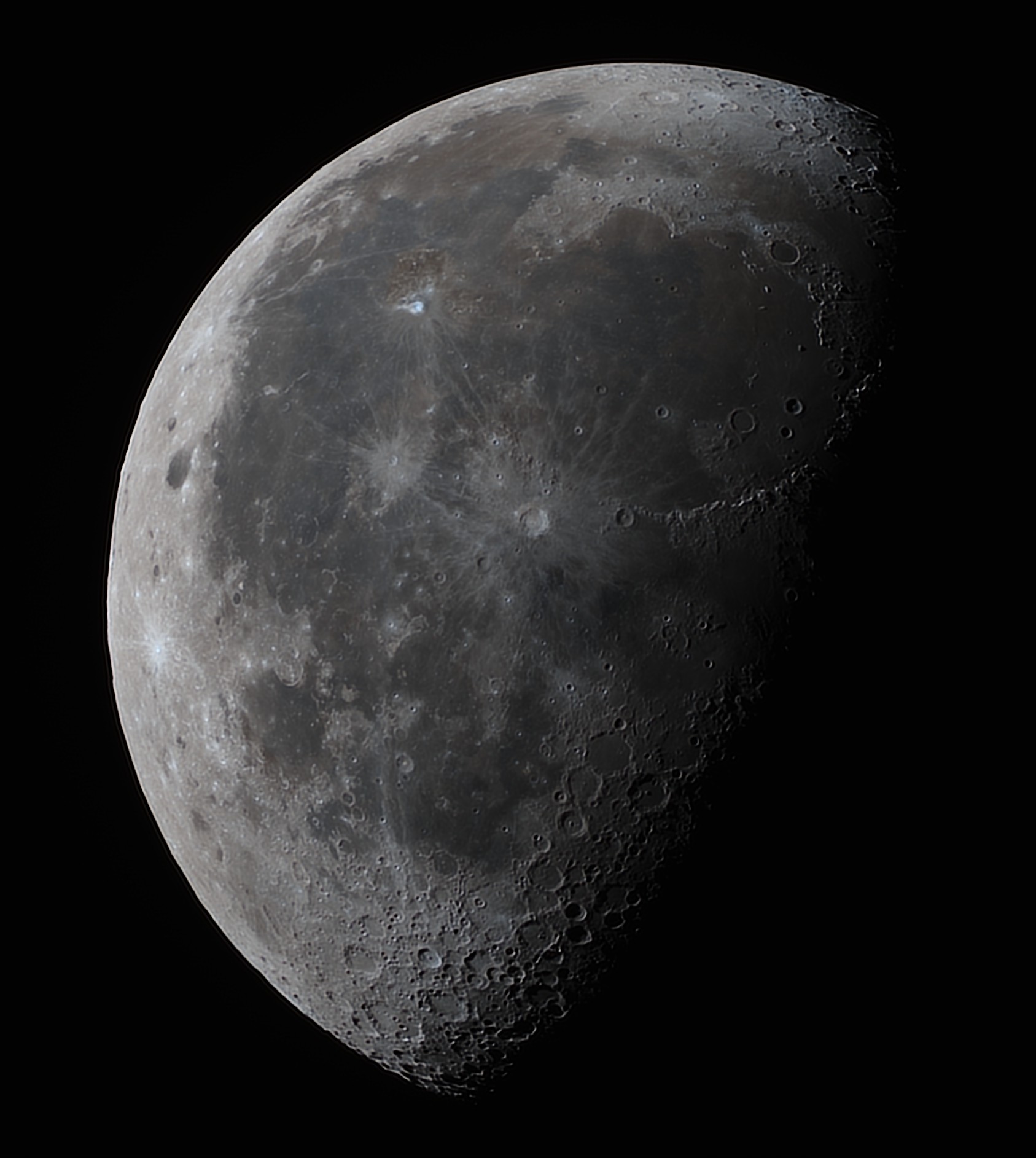 A világosabb színű területek a hegyvidékek. Ha elég éles a szemünk, akkor a felszínen még láthatunk nagyobb becsapódási krátereket, köztük a Copernicus-, a Kepler-, az Aristarchus- és a Tycho-krátereket. Távcsővel több részletet látunk, az egyszerű holdkráterek általában kicsik, átmérőjük 10-15 km. A nagyobbak átmérője pedig meghaladja a 15 km-t. A medencék hatalmas kráterek, átmérőjük sokszor nagyobb 300 km-nél. Több mint 40 becsapódási medence található a Holdon.