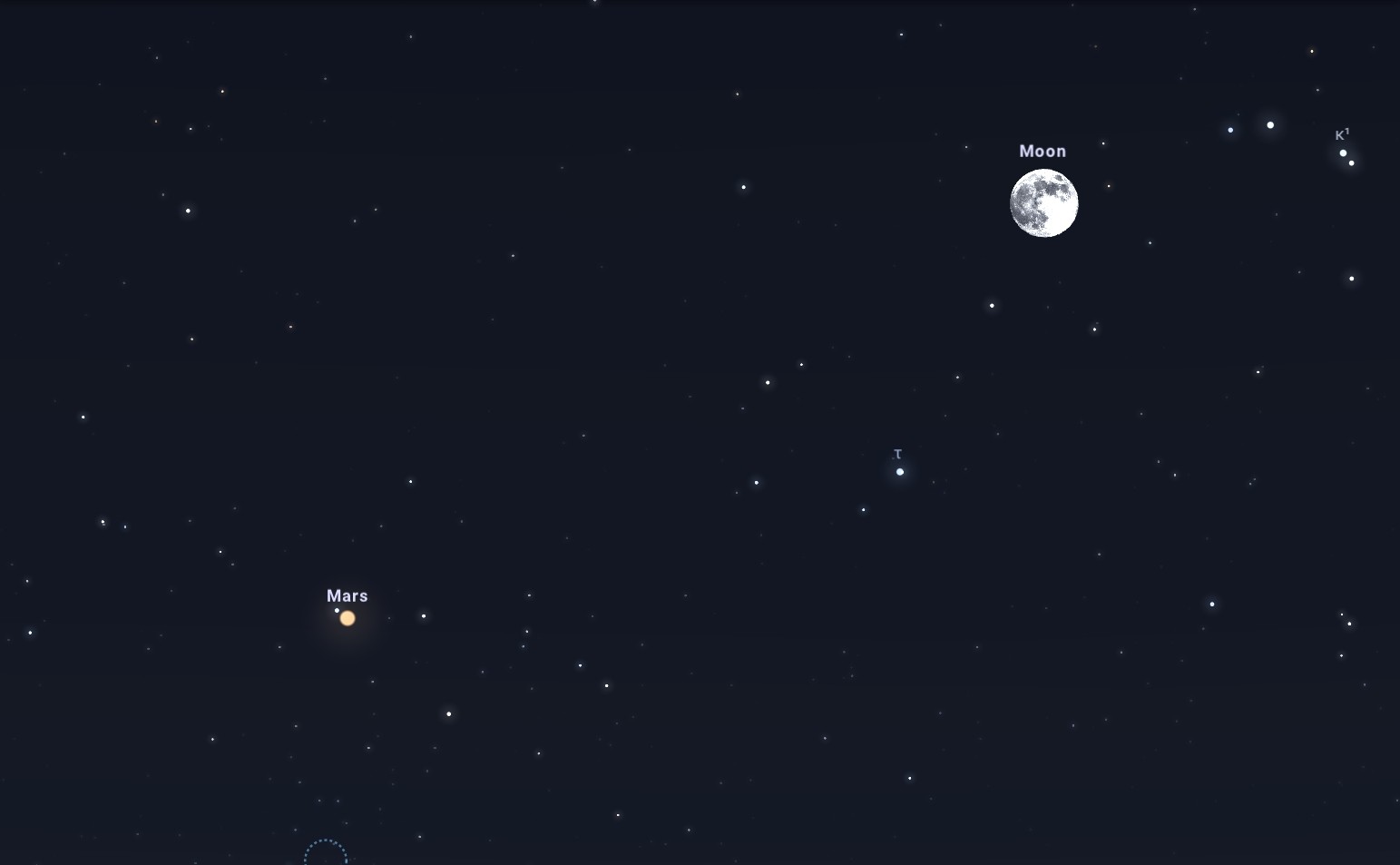 A Mars előző este is tartogat már egy szép meglepetést, érdemes meglesnünk koraesti együttállását a 98 Tauris csillaggal. A Mars az esti szürkületben, 17:11-kor, a tőle északra 5,6 ívpercre távolságban fekvő, 5,8 magnitúdó fényességű csillaggal köt majd időleges szövetséget. E barátság a Hold 30 ívmásodperces átmérőjének egyötödénél is közelebb hozza őket, binokulárban, vagy kis távcsővel pompás látványt fognak nyújtani!