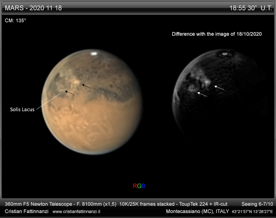 Az viszont tény, hogy a Mars szeme ezen a napon elfátyolosodott: A híres Solis Lacus alakzat fölött két új vihar gócpont alakult ki. A Solis Lacus a Mars egyik legdinamikusabban változó albedóterülete.