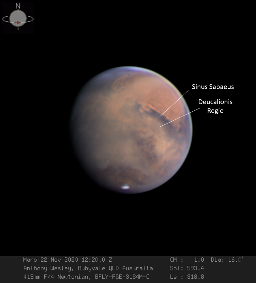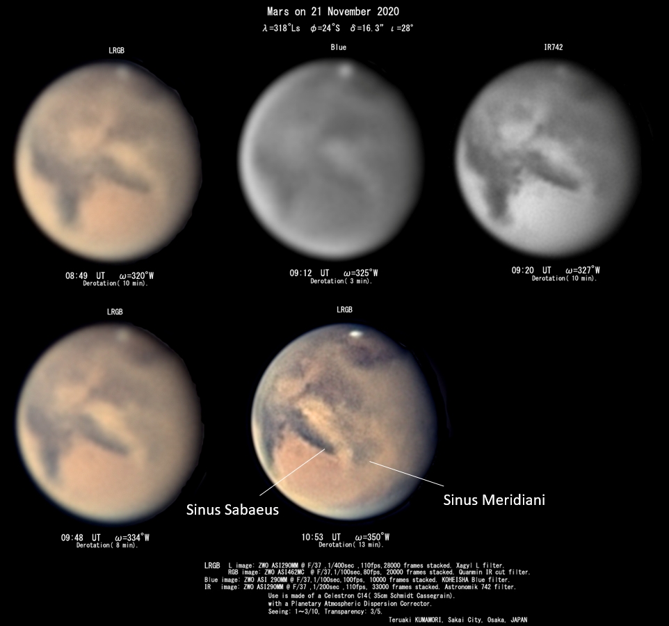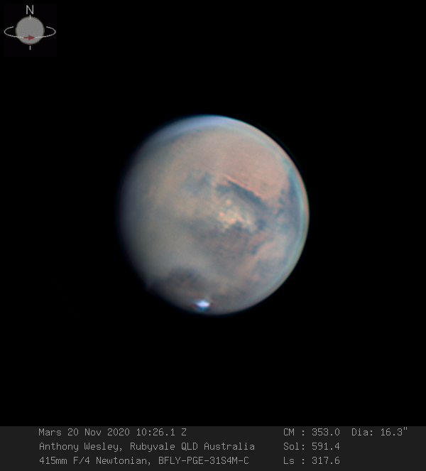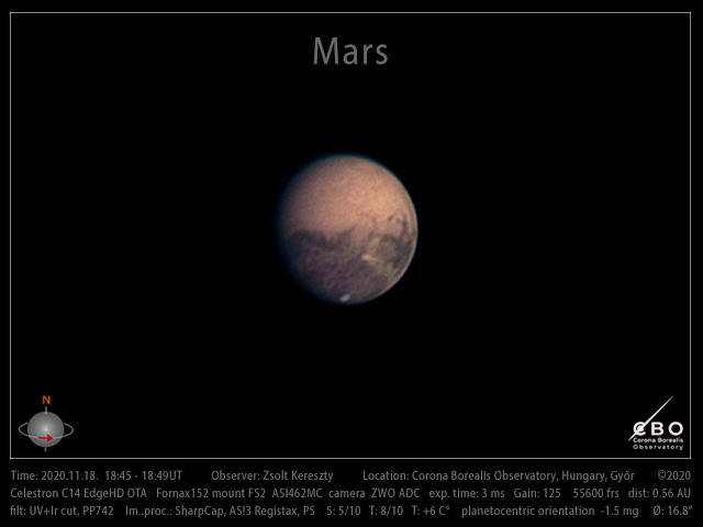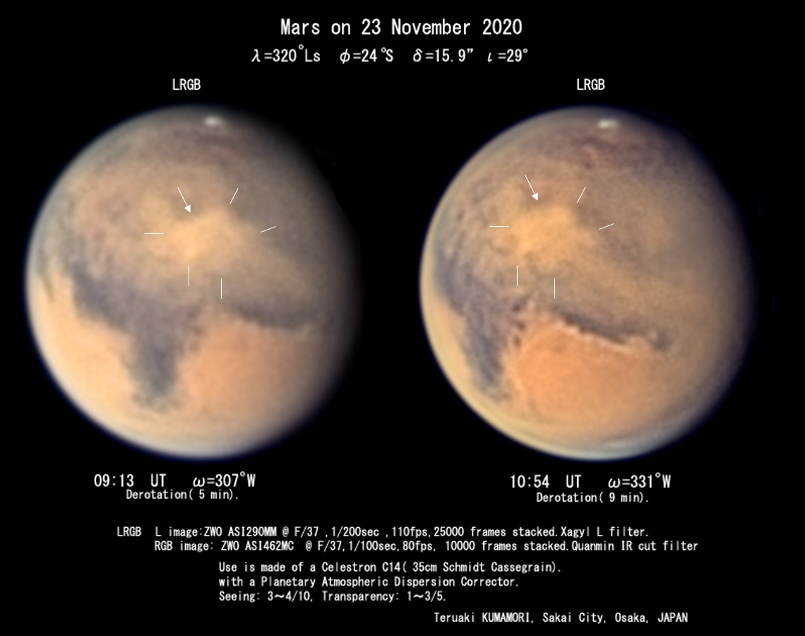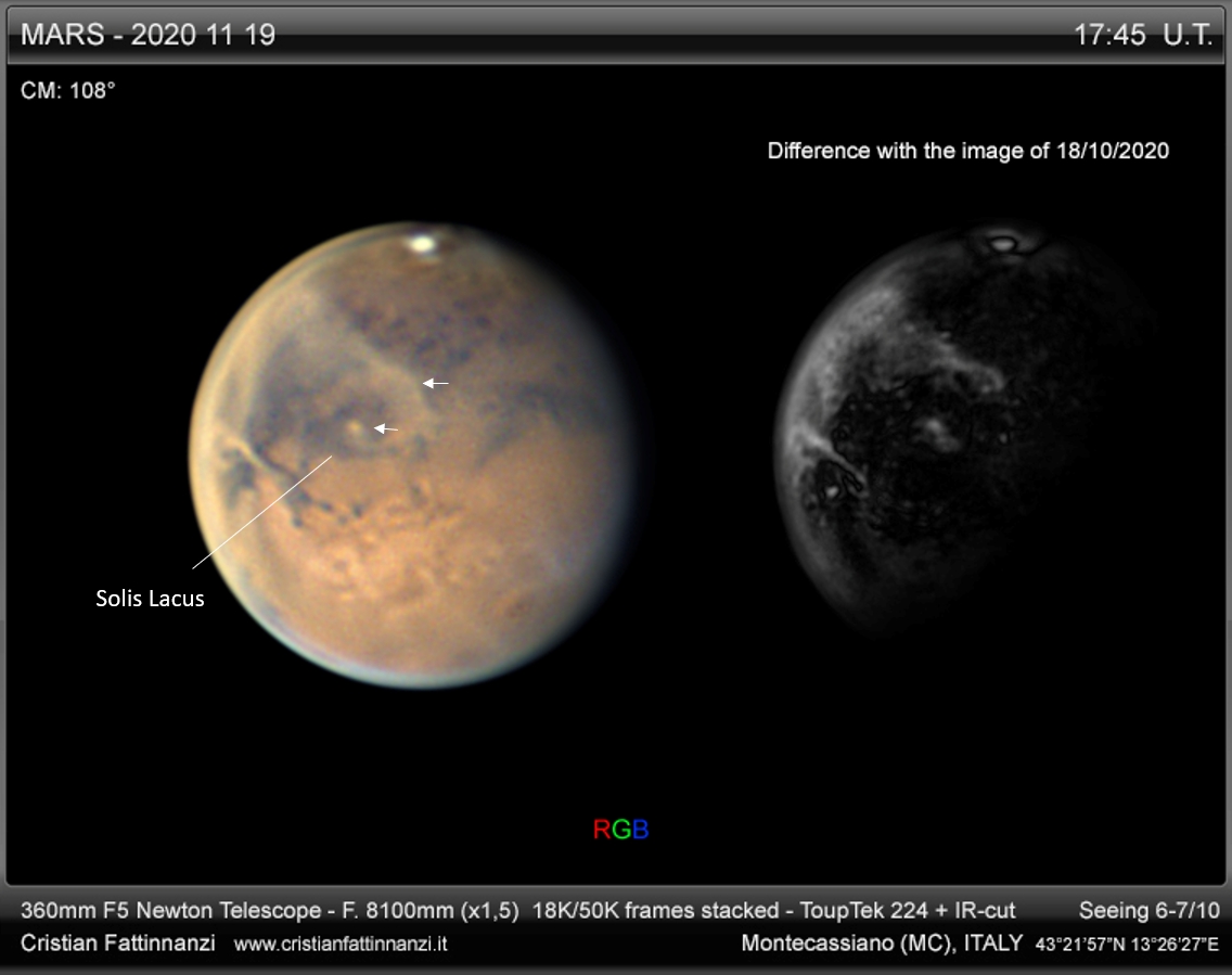 📸 Borítókép: A Solis Lacus fölött kitört két új vihar gócpont, és a belőle származó, balra fölfelé elhúzódó, több ezer kilométeres porsáv M. Rodriguez felvételén, 2020.11.17 18:49 UT-kor. Forrás: ALPO Japan