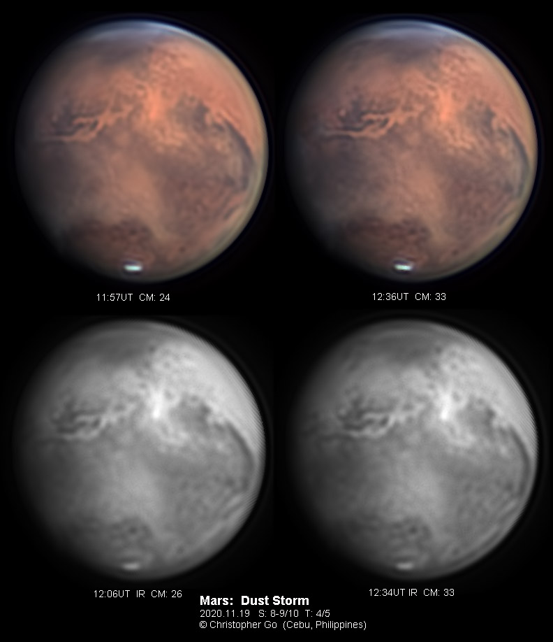 Christopher Go fotóján pedig láthatjuk, ahogy a magasabb légkörben a porfelhő egészen az Argyre medencéjén túlra hatol, és egészen délre, a Depressiones Hellesponticae területéig felnyúlik.