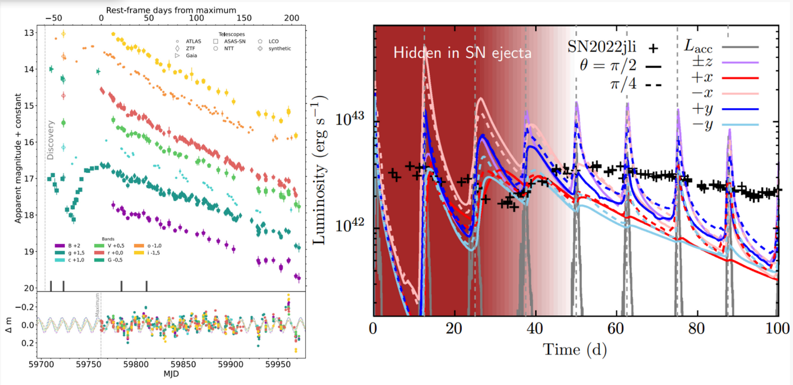Ez a cikk az SN2022jli jelzésű szupernóváról szól, amelynek fénygörbéje koránt sem mondható átlagosnak: a felfényesedés és a csúcsfényesség után ahelyett, hogy fokozatosan elhalványulna, periodikusan, kb. 12,5 naponta újabb felfényesedéseket mutat. Ezt a különleges viselkedést a kutatók két lehetséges forgatókönyvvel magyarázzák: az egyik szerint a periodikus felfényesedés oka a csillag által korábban ledobott, a csillag magja körül koncentrikusan elhelyezkedő csillagkörüli anyaggal történő kölcsönhatás. A másik elmélet szerint a szupernóvaként felrobbanó csillag kettős rendszerben kering egy másik csillaggal, amellyel minden keringési periódus alatt kölcsönhatásba lép. Egy nemrégiben megjelent tanulmány ez utóbbi lehetőséget vizsgálja háromdimenziós szimulációk futtatásával.