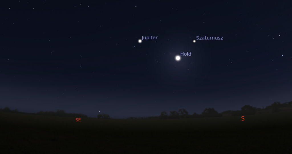 Akkor se búsuljunk, ha esetleg elszalasztjuk az Antares és Vénusz párosát - az égbolt másik felén, jóformán egész éjszaka, legalábbis este 11-ig mindenképp szépen látszik majd a Jupiter, Szaturnusz és Hold tág, de annál fenségesebb háromszöge.