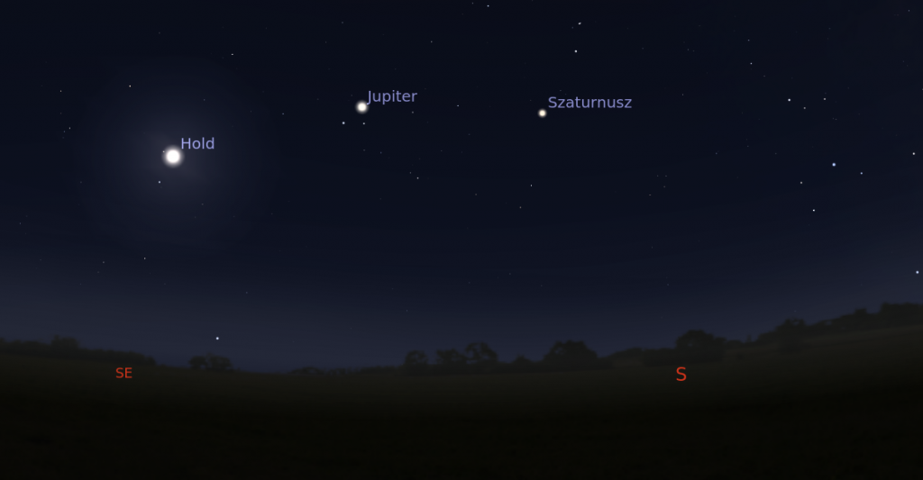 A két bolygó nem sokat mozdul el pár nap során egymáshoz képest (15 fokra, azaz 30 holdátmérőnyire vannak egymástól), a Hold azonban a napokban látványos látogatást téve elsuhan a páros alatt. Szerdán, október 13-án a Szaturnusztól nyugatra látható az 56%-os félhold, majd 14-én alkotja a három égitest a legszorosabb háromszöget.