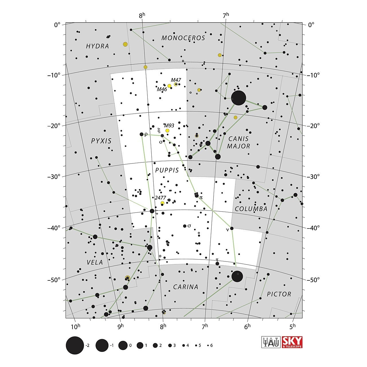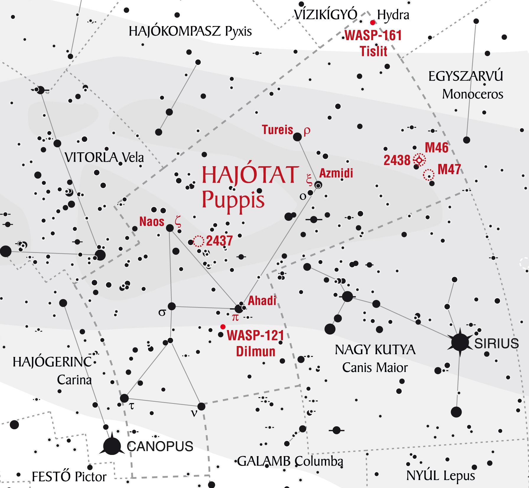 - Messier 47 (NGC 2422): nyílthalmaz, amely kb. 1600 fényévre helyezkedik el, és nagyjából 78 millió éves. Körülbelül 500 csillag tartozik a halmazhoz, a leghalványabb valószínű egy 19 magnitúdójú vörös törpe. A legfényesebb pedig a HD 60855 (5,7 magnitúdó).