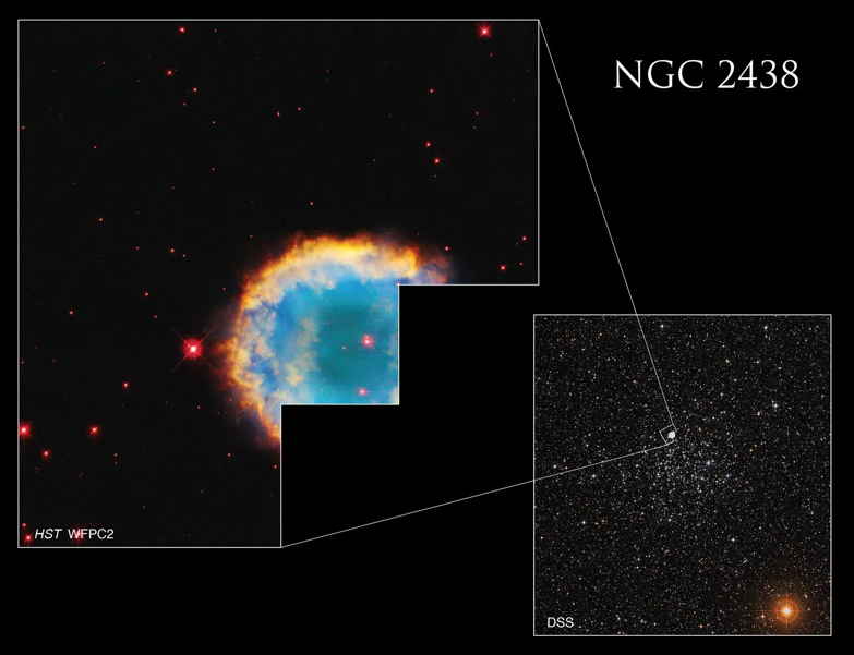 - NGC 2438: planetáris köd, amelynek központi csillaga 1370 fényévre található. Úgy tűnik, mintha az M46 halmazon belül helyezkedne el, de valószínűleg nincs köze hozzá, mivel nem látóirányú mozgása eltér a csillaghalmaz radiális sebességétől. Egy Nap-típusú csillag halála során keletkezett.