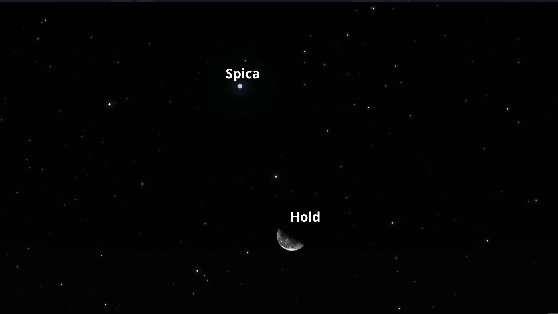Megfigyelés: a Spica és a Hold párosát szabad szemmel észlelhetjük, azonban az alacsony égi helyzetük miatt tereptárgymentes délkeleti horizontra lesz szükségünk.