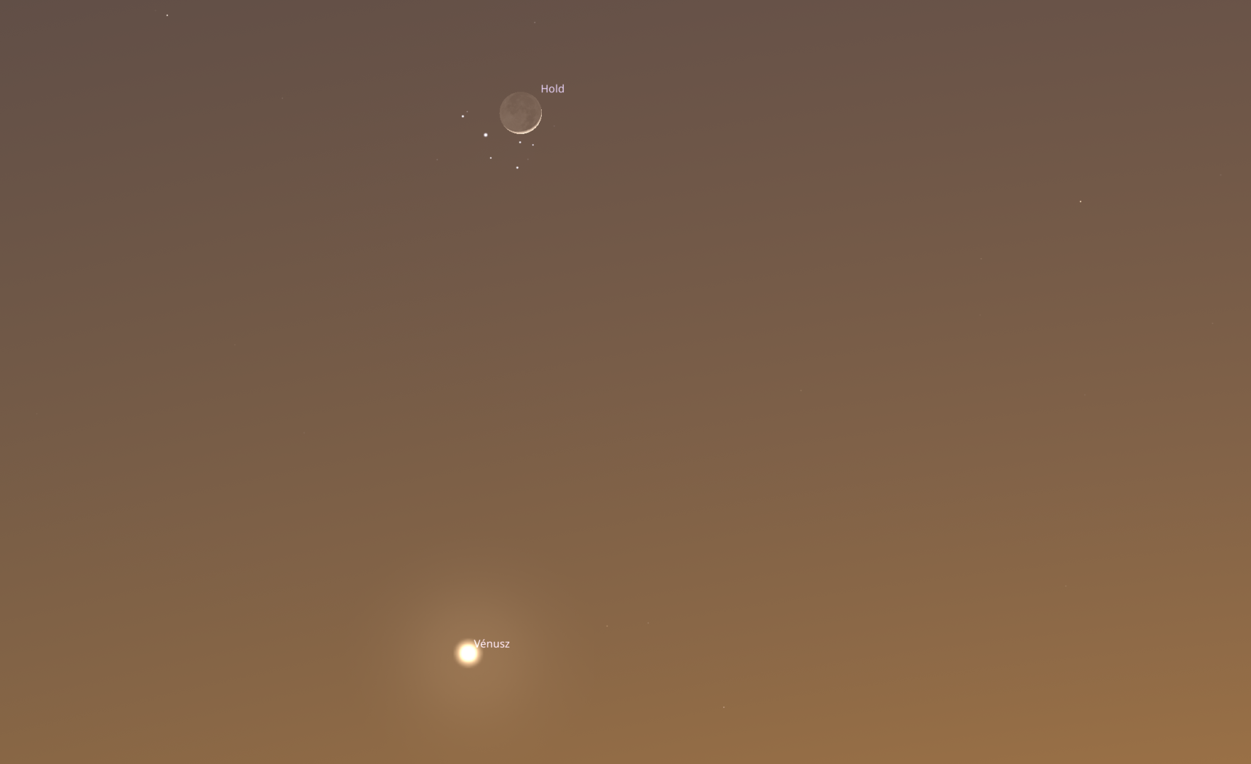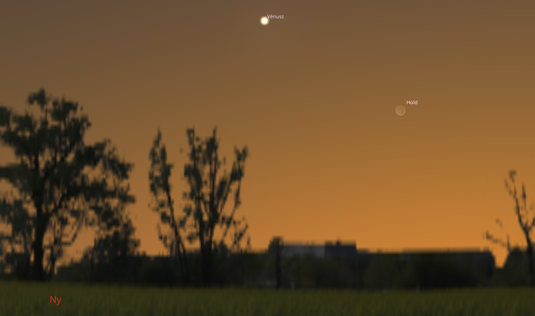 Ezen a remélhetőleg tavaszias szombat estén érdemes megnézni a naplementét és az utána következő szürkületet. Este 20:10-kor, a polgári szürkület végén ugyanis megfigyelhetjük a Vénusz és a holdsarló laza együttállását. Ezen a napon a Vénuszt egyszerűbben vehetjük észre, mint a Holdat, a -3,9 magnitúdós bolygó ugyanis látványosabb lesz az alig látszó, egészen keskeny holdsarlónál. A Vénusz az együttállás idején 16 fokos magasságban látszik a nyugati horizont felett, így minden mással összekeverhetetlenül emelkedik ki a háttérből.