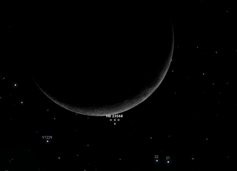 Csupán két percet kell várnunk arra, hogy 20:48-kor egy szoros csillagpár tagjai, a 11 magnitúdós HD 23627B és a 8,8 magnitúdós HD 23672A is kilépjenek a Hold mögül, de a kettősnek csak a halványabb tagja után 7 másodperccel később kilépő fényesebb tagját láthatjuk majd távcsőben kibukkanni.