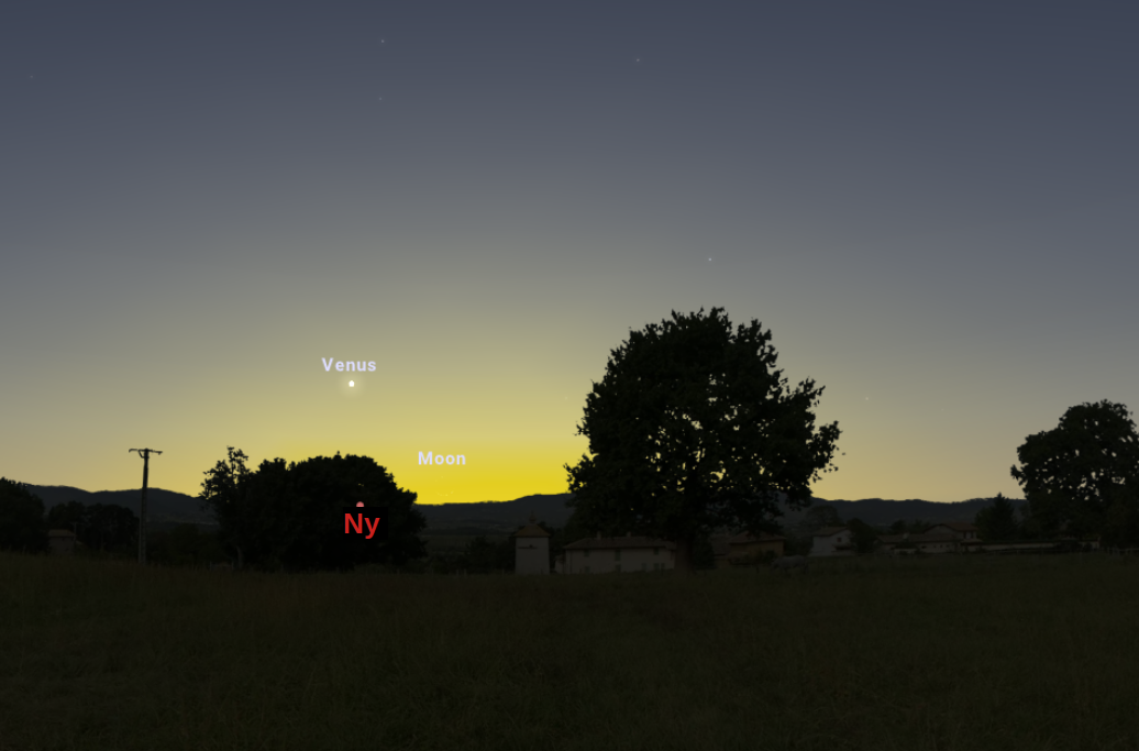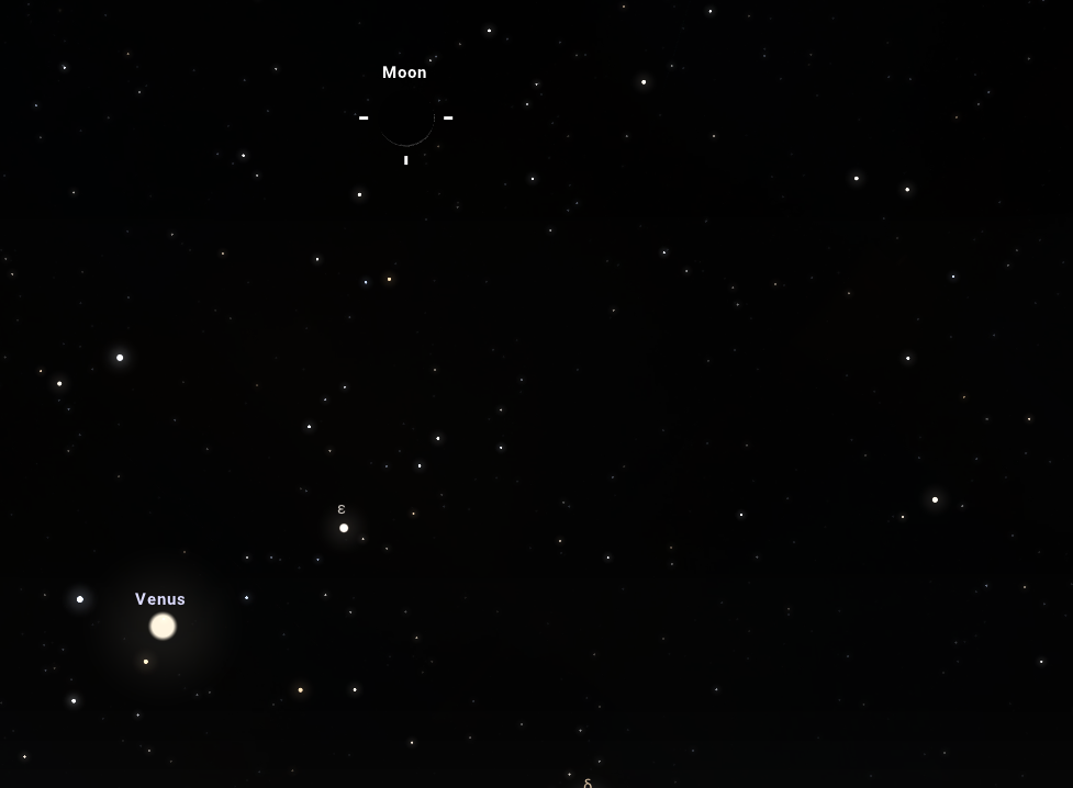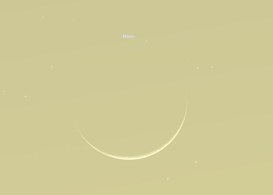 Aki csütörtökön lemaradt az észlelésről borult idő vagy egyéb elfoglaltság miatt, pénteken is megtekintheti a Hold vékony sarlójának a Vénusszal történő együttállását. Ezen a napon este 18:27-kor a 40 óra 4 perces holdsarló, bár még mindig igazán vékony, már 3%-os fázist mutat, így az előző napinál egyszerűbben észrevehetjük, akár szabad szemmel is.