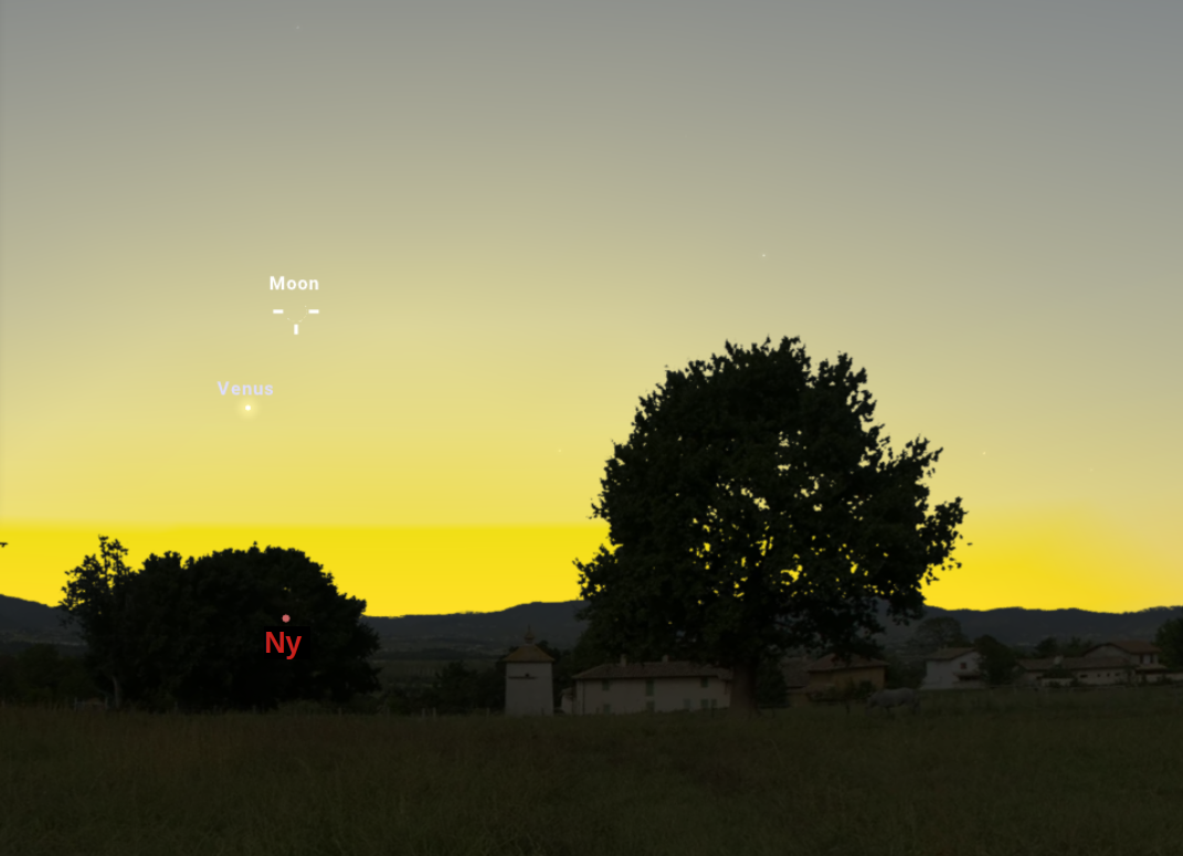 A Hold az együttállás időpontjában már fentebb, 15 fokos magasságban látszik majd a nyugati égbolton, a Vénusz pedig égi kísérőnktől balra lentebb, 5,1 fokos távolságban, 9,8 fokkal a látóhatár felett. A -3,9 magnitúdós Esthajnalcsillagot ezúttal is egyszerűbben észrevehetjük, mint a Holdat, így naplemente utáni megkeresése támpontul szolgálhat a Hold megtalálásához és az együttállás megfigyeléséhez.