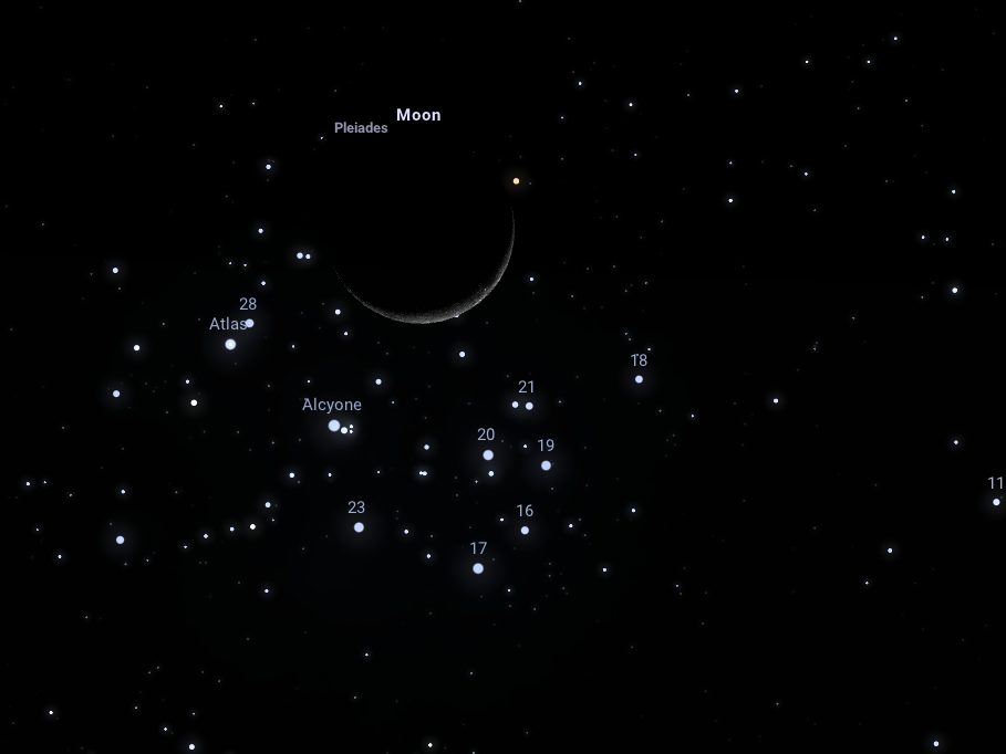A holdsarló és a Fiastyúk együttállása: ezen a szép, tavaszi vasárnap estén különleges együttállást figyelhetünk meg: szoros közelségbe kerül ugyanis a 7%-os, 2,3 napos holdsarló, alattuk pedig, egy kicsit távolabb még a fényes Vénuszt is megfigyelhetjük már a polgári szürkület végén, 20:11-kor. Kicsit több mint fél óra múlva, 20:45-kor megkezdődik egy még látványosabb esemény, mégpedig a Fiastyúk fedése: a nyílthalmaz csillagai közül jó néhány belép a Hold mögé annak sötét oldalánál, majd kilép a világos oldalon. Az együttállás megfigyelése nem igényel távcsövet, sem különösebb tapasztalatot, a csillagfedések észleléséhez azonban mindenképpen távcső használata javasolt. Ha csak egy égi jelenséget nézünk meg ebben a hónapban, ezt mindenképpen érdemes!