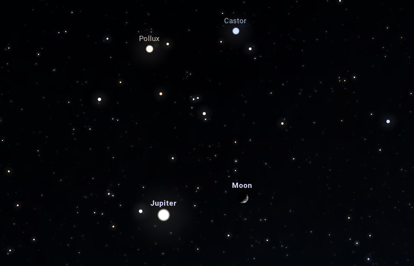 A Pollux, a Castor, a Jupiter és a Hold téglalapot alkot: a nyugati égen ugyanezen a estén, 9 órakor a négy égitest, tehát az Ikrek csillagkép két legfényesebb csillaga, valamint a Jupiter és a 35%-os fázisú Hold egy álló téglalap négy csúcsát jelöli ki. Az együttállás résztvevői 3-4 fokos távolságban látszanak majd egymástól, és a Hold a közelség pillanatában 47 fokos magasságba ér az égen. A meteorrajjal egybekötve érdemes tehát már sötétedés után megkeresni ezeket a szabad szemmel is fényes égitesteket.