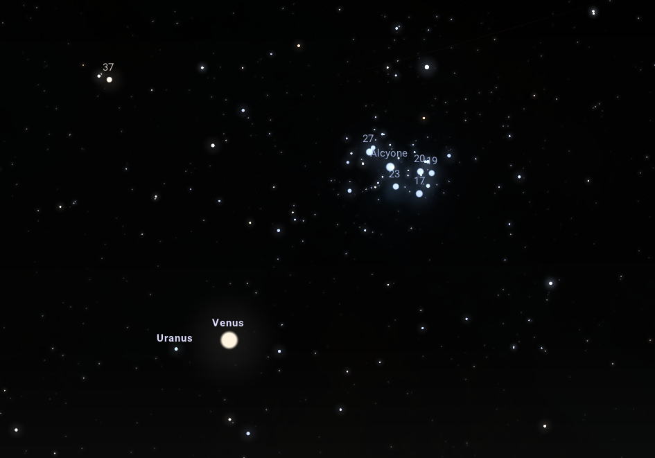 A Vénusz és az Uránusz szoros együttállása a Fiastyúk közelében: este 21:00-kor érdekes együttállásnak lehetünk tanúi, amelynek két főszereplője a fényes Esthajnalcsillag és az 5,8 magnitúdós látszó fényességű Uránusz. A két bolygó mindössze 49'-re látszik majd egymástól a nyugati horizont felett 9,5 fokkal, így a megfigyelés különösen izgalmas lehet binokulárral is. A páros felett jobbra, 3,5 fokos távolságban látszik majd a Fiastyúk szabad szemmel is megfigyelhető, jellegzetes alakú nyílthalmaza.