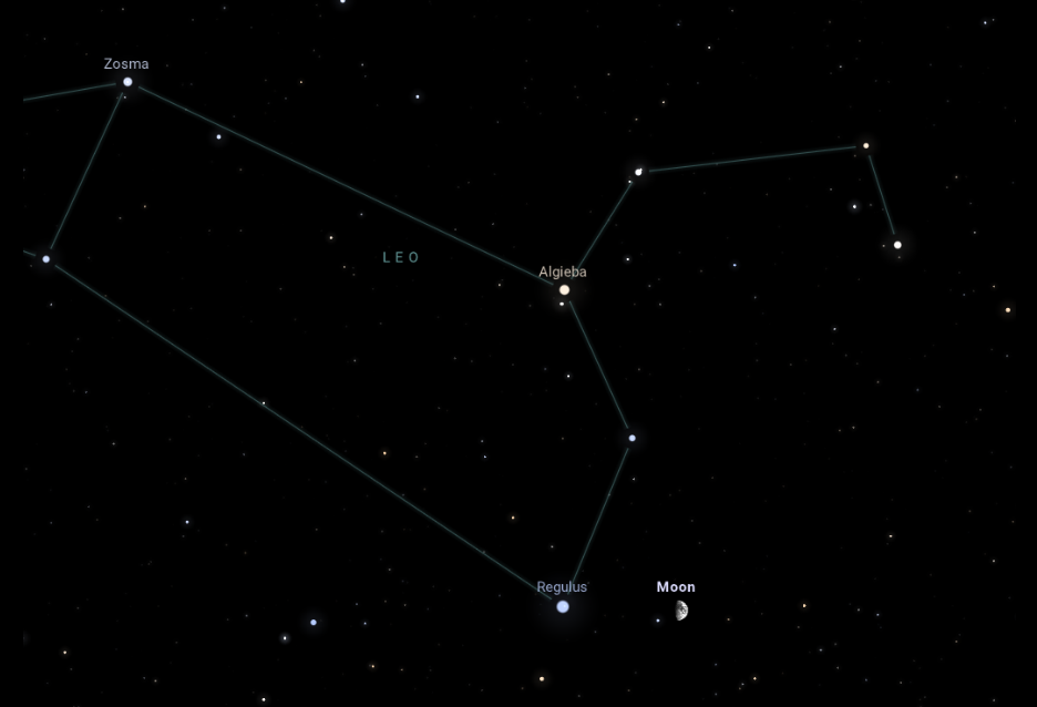 A Regulus és a Hold együttállása: a hónap utolsó kiemelt jelensége az immáron 68%-os fázisú Holdnak az Oroszlán csillagkép legfényesebb csillagával történő együttállása este 10 órakor, amelynek során a két égitest egymástól 2,8 fokos távolságban látszik majd, 50 fokkal a horizont felett. A két égitest még közelebb ér egymáshoz másnap hajnalban, 2:25-kor, mégpedig 52 ívpercre, ehhez a látványhoz viszont sokáig fenn kell maradni.
