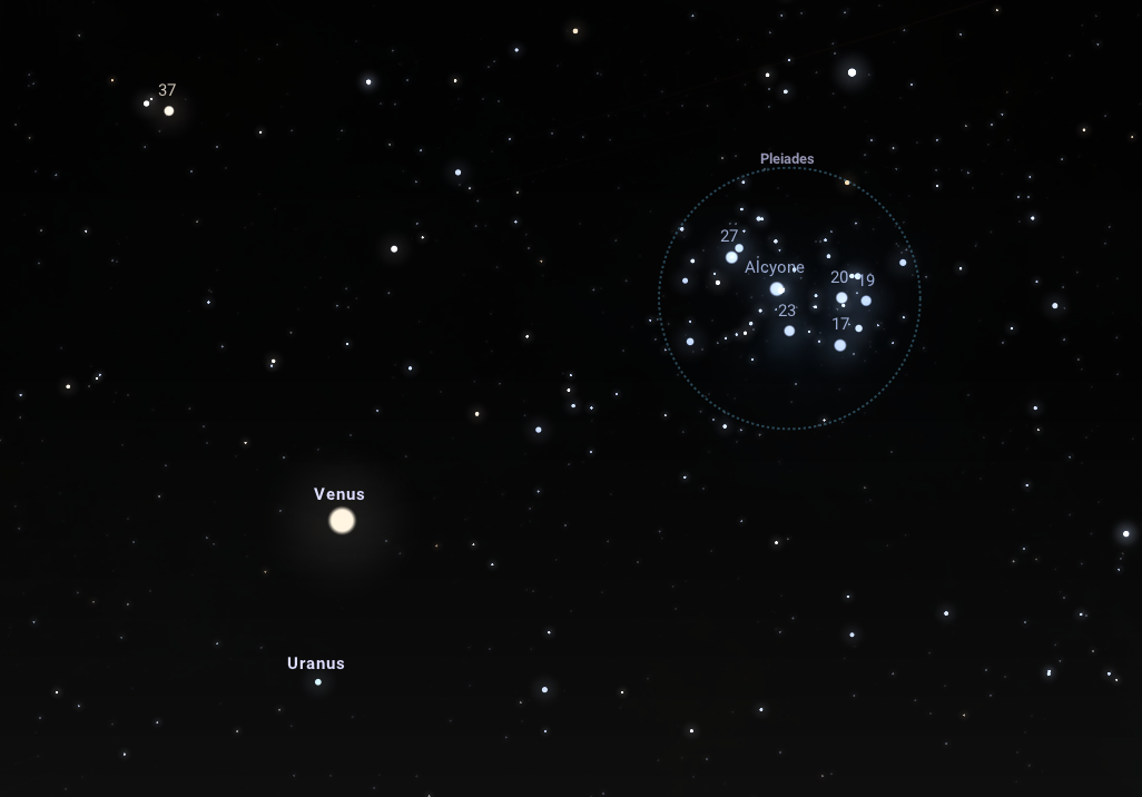 Minden csillagászat iránt érdeklődőt bátorítunk tehát, hogy április vége felé közeledve nézzen fel az égboltra, és keresse meg a szabad szemmel is látható Vénuszt és a Fiastyúkot, binokulárjában pedig keresse meg az Uránuszt is. Egy kisebb nagyítású kézi látcső látómezejébe pedig mindhárman egyszerre beleférnek majd!