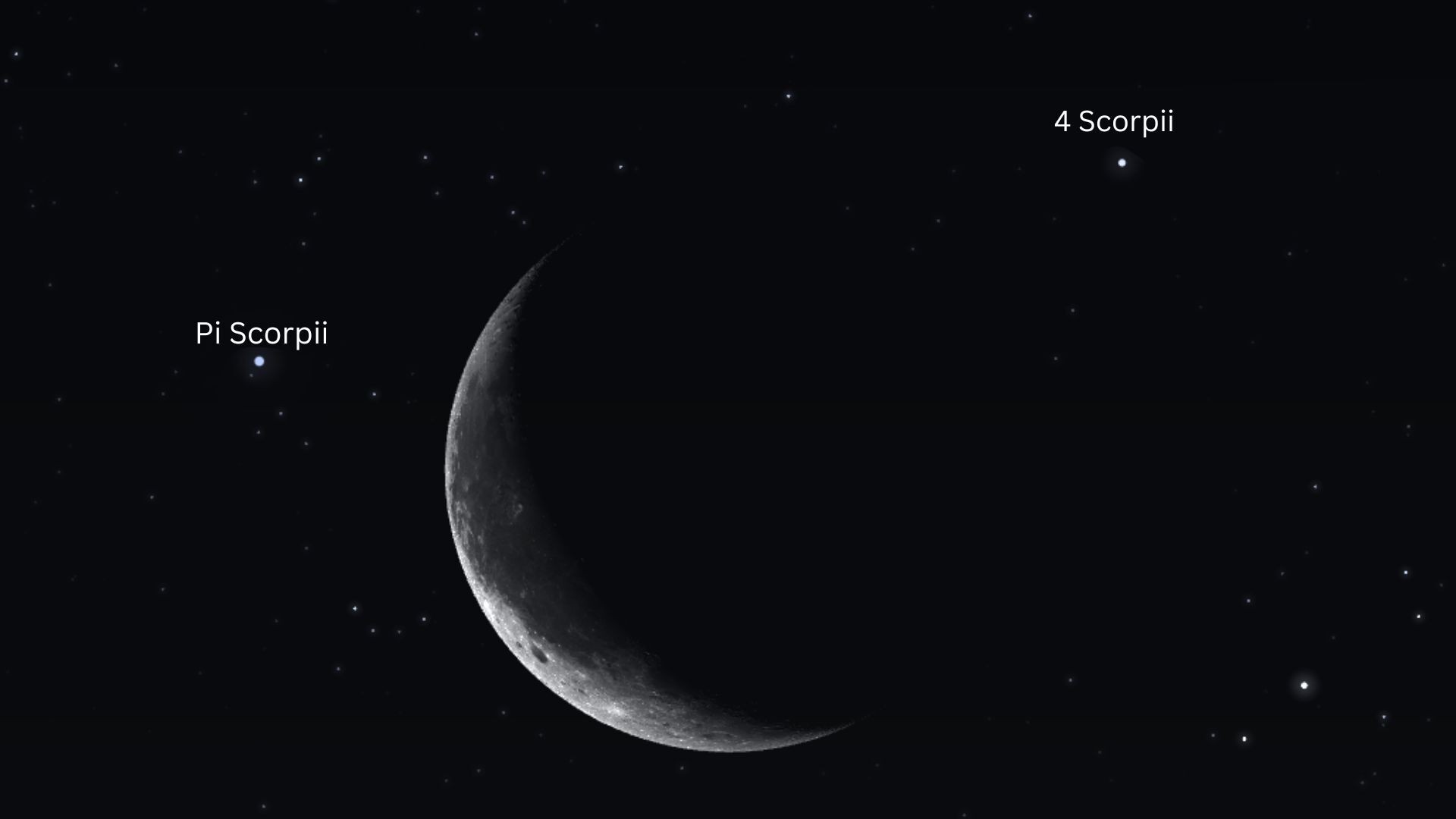 Ezt követően a Hold egyre közelebb somfordál a pi Scorpiihoz, ami jóval fényesebb, mint az imént eltakart csillag. A maga 2,9 magnitúdós fényességével szabad szemmel is könnyedén látható, ha elég magasan van a látóhatár fölött. A holdsarló az okkultáció után egészen 6:10-ig megközelíti a csillagot. A két égitest közötti ekkor a minimális távolság 7’ lesz, nagyon szoros együttállást eredményezve. A Hold látszó átmérője csak kicsit lesz kisebb mint 30', a csillag és égi kísérőnk közti távolság ennek kevesebb mint negyede lesz.