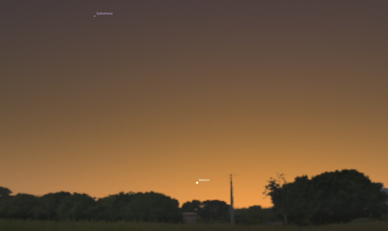 17:57-kor következik be a Merkúr és a Vénusz együttállása, amikor a két bolygó kis szögtávolságra látszik egymástól az alkonyi égen. A Merkúr ekkor már a láthatóság végéhez közeledik: a polgári szürkület végén mindössze körülbelül 7°-os magasságban helyezkedik el a nyugati horizont felett. Megvilágítottsága csupán 15%, vagyis a bolygó vékony sarló alakban látszik. Ez a fázis annak a következménye, hogy a Merkúr gyorsan közeledik az alsó együttálláshoz, amikor a Nap és a Föld között halad el és a megvilágított oldala egyre inkább elfordul a földi megfigyelőtől. A kis megvilágítottság ellentéteként a Merkúr látszó átmérője 9,2 ívmásodpercre növekszik, ami a Földhöz való közelségének következménye. A méretnövekedés következtében a bolygó fényessége ekkor +1,4 magnitúdó. A látóhatárhoz közeli helyzet, a szürkületi háttérfény és a jelentős légköri extinkció miatt a Merkúr önmagában nehezen található meg, szabad szemmel biztosan nem látszik ekkor.