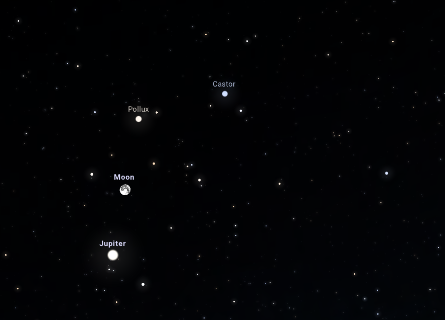 Szombaton este érdemes megkeresni a teliholdat már a felkelésekor, hiszen égi kísérőnk látóhatárhoz közel önmagában is látványos. Este 18:00-kor pedig már eléggé sötét lesz ahhoz, hogy feltűnjön a 15 fokkal a horizont felett látható Hold kíséretében a keleti égen a Jupiter, a Castor, továbbá a Pollux.