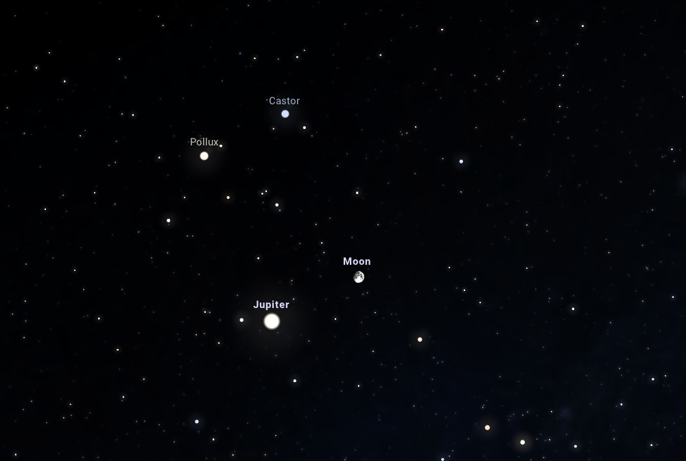 Téglalapot alkot a Castor, a Pollux, a Jupiter és a Hold: szinte már megszokhattuk, hogy ez a négy égitest jellegzetes alakot ölt az égen, s ezúttal sincs másképp. Este 23:15-kor a 95%-os fázisú Hold téglalap alakba rendeződik a Jupiterrel, illetve az Ikrek csillagkép két legfényesebb csillagával, a Castorral és Polluxszal. A Hold és a Jupiter távolsága 4,5 fokos lesz, a Jupiter pedig 63 fokkal a horizont felett látszik majd.